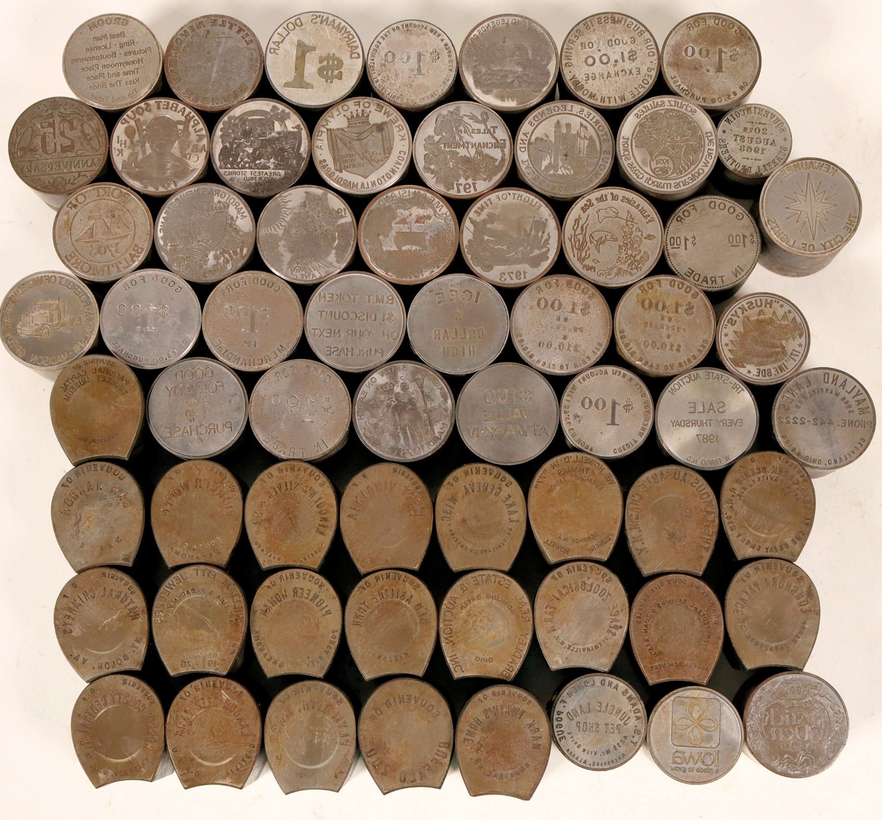 A set of 41 round token dies, mostly about 1-1/2-inch diameter (a few smaller) and 22 horseshoe-shaped token dies that intended to be used as coin encasements. Several "Good For $1" designs and many Mardi Gras-related artistic dies. These were created by a Seattle-area diecutter in the mid-twentieth century and are now available as unique collectibles. Use them as interesting decorative items or very effective and eye-catching paperweights.