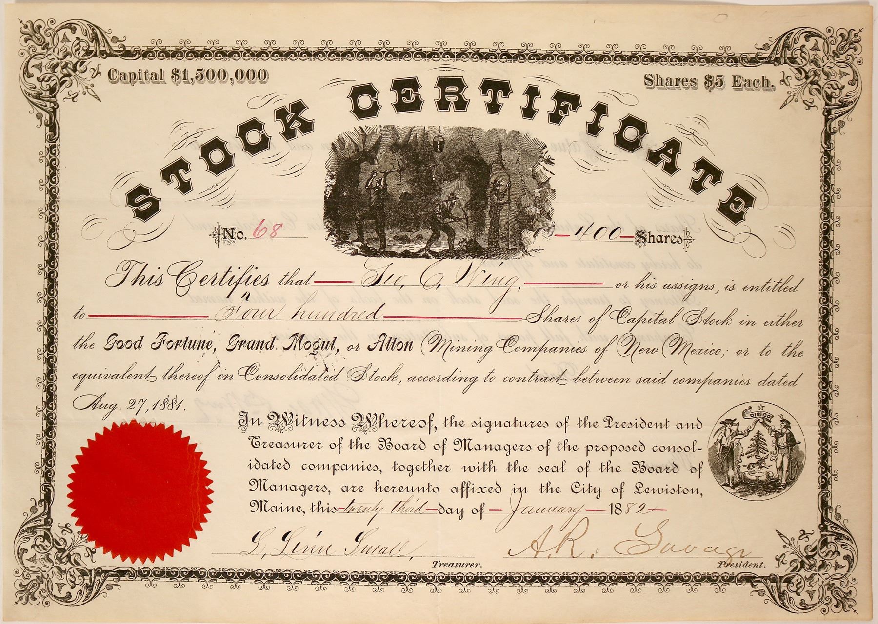 # 68 for 400 shares to George C Wing. Signed by L Linn Small and president AR Savage. Dateline Lewiston, Maine 1882. Incorporated 1881. Not cancelled. Underground mining vignette. No pin hole, edge, corner or discoloration issues. The Las Cruces Sun-News reported in 1883 that little development has been done in the new San Andres Mining District. The Good Fortune may be the furthest along with a shaft 65 feet deep and showing a streak from 4 to 6 feet in width. They had 500 tons of ore in their dump. It is a mixture of liver and lead. Ken Prag Collection