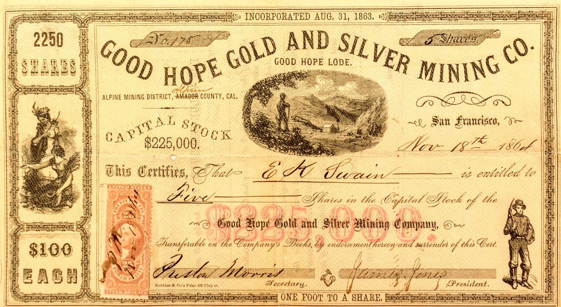 Good Hope Lode. Inc. 1863. Rare, early Alpine Mining District stock dated Nov. 18th, 1864. Issued to E.K. Swain for five shares. Signed by the president, James Jones, and secretary, Morris. Revenue stamp attached. Serial number 175. Allegorical and mining vignettes. 9 3/4 x 5 1/2 inches. Some nicks along edges and folds. State: California City: Alpine County HWAC#: 48622 Date: 1864