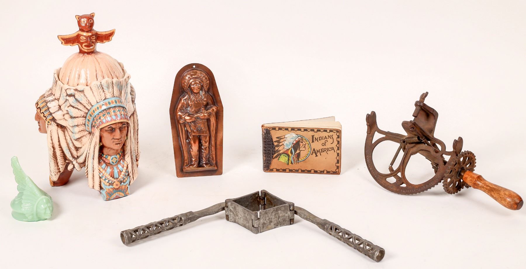 This is a tabletop mounted apple peeler made by the Goodell Co. of Antrim, New Hampshire. patent date of March 10, 1884. Original handle and in working condition. There is also a vintage nut cracker, a cookie form, and an indian candy jar.