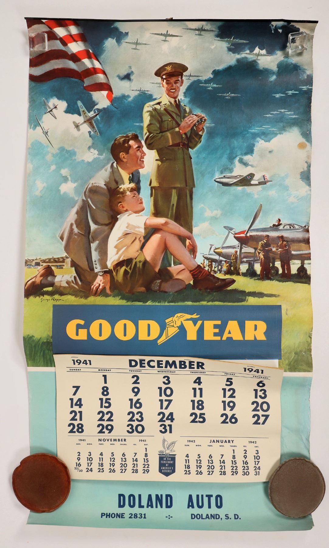 Goodyear WWII era calendar - featuring Pearl Harbor Day, Dec. 7, 1941 - with a color lithograph of the painting, "The Air Show," signed in left corner by the artist, George Rapp. The linen-backed calendar is complete, with the months December 1941-December 1942. Advertisement for Doland Auto, Doland, South Dakota, across bottom. Approximately 20.5"w x 37"h. Rolled with small .5" brown stain on right edge and minor wear along sides. Rapp (1898-1941) was a commercial artist known for illustration during the late 19th and early 20th Century.