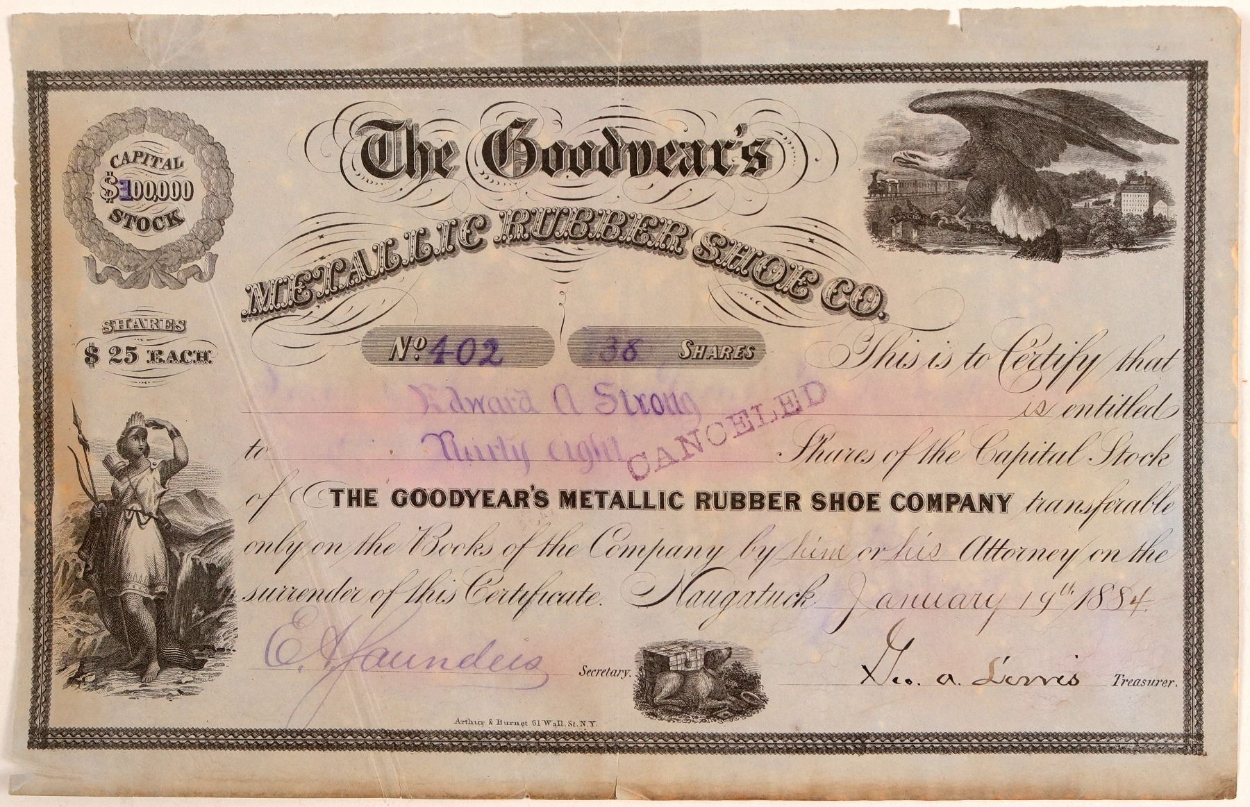 No. 402, issued for 38 shares to Edward A. Strong on Jan. 19th, 1884 in Naugatuck, CT. Signed by secretary E.A. Saunders and treasurer Geo. Lorris. Stamp cancelled. Black border and print on blue paper. Three vignettes: eagle, dog, and allegorical woman. Printed by Arthur & Burnet. 6 x 9.5" Folds, toning, tape repairs, small tears. Possible water damage (purple ink has bled). Organized in the 1840s. First licensee of vulcanization, discovered and patented by Charles Goodyear. In 1892, they combined with other companies to form US Rubber Company. Ken Prag Collection