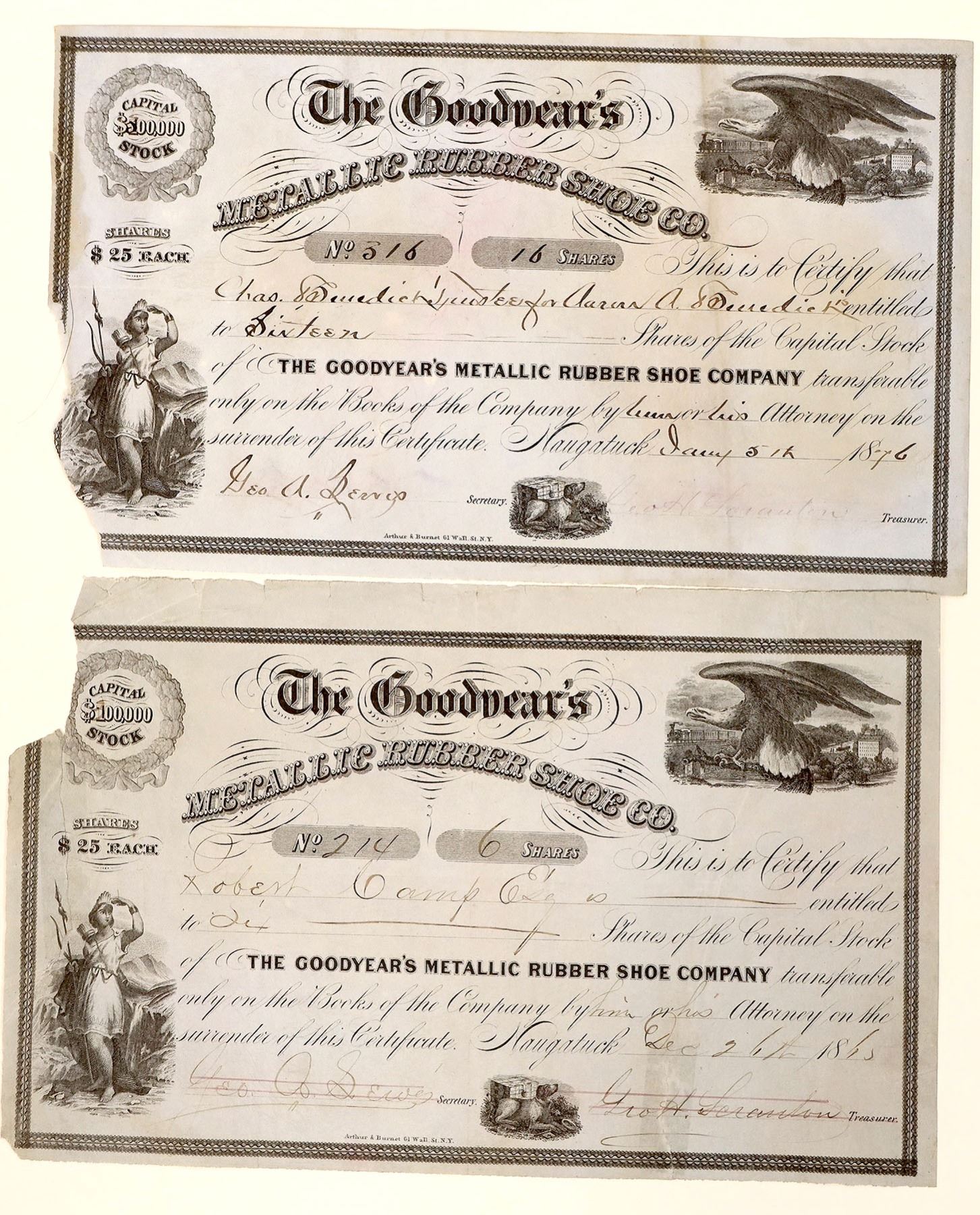 2 issued 1875 and 1876 Goodyear's Metallic Rubber Shoe stock. Left damage on both, verso tape repair on 1875. Please inspect.