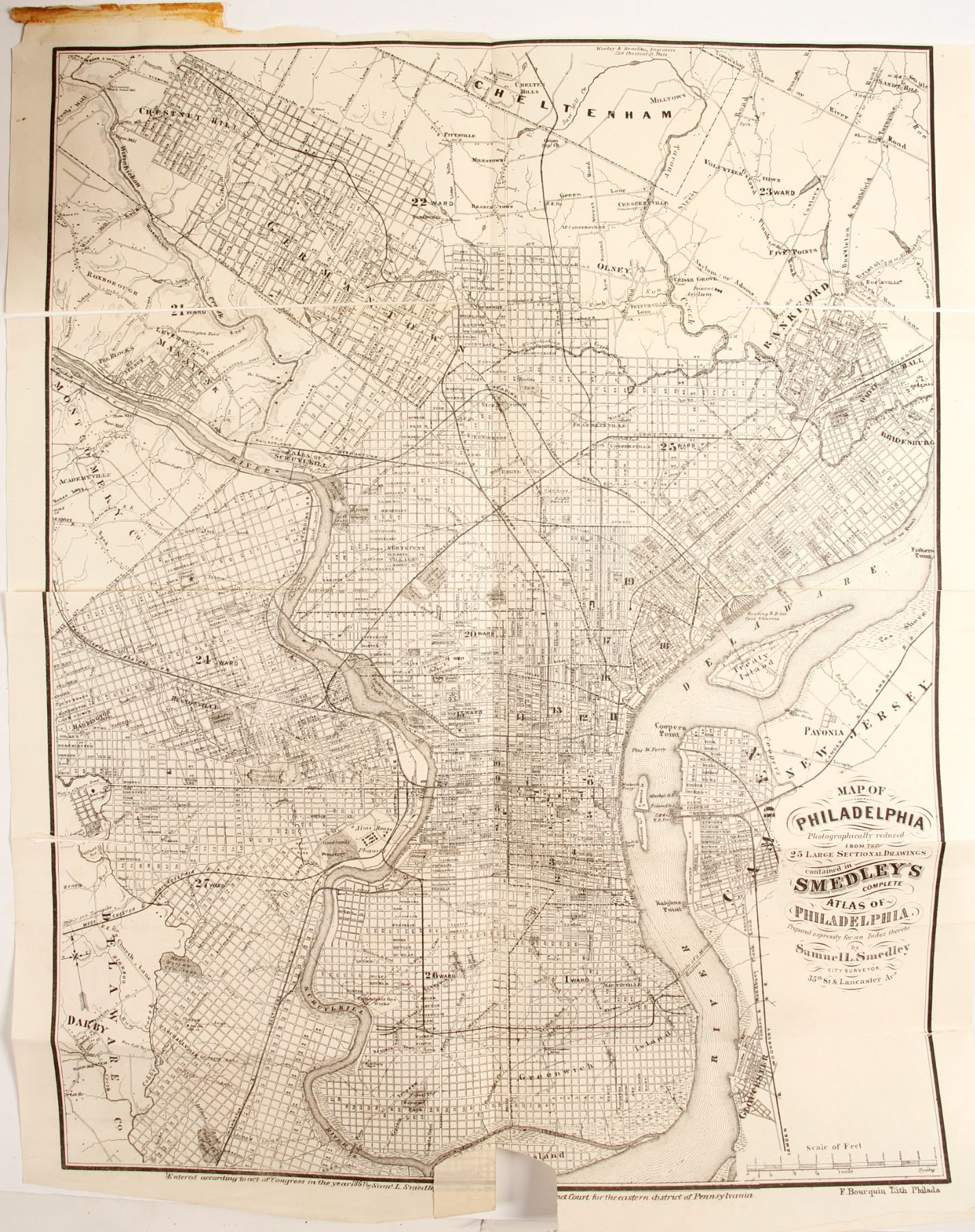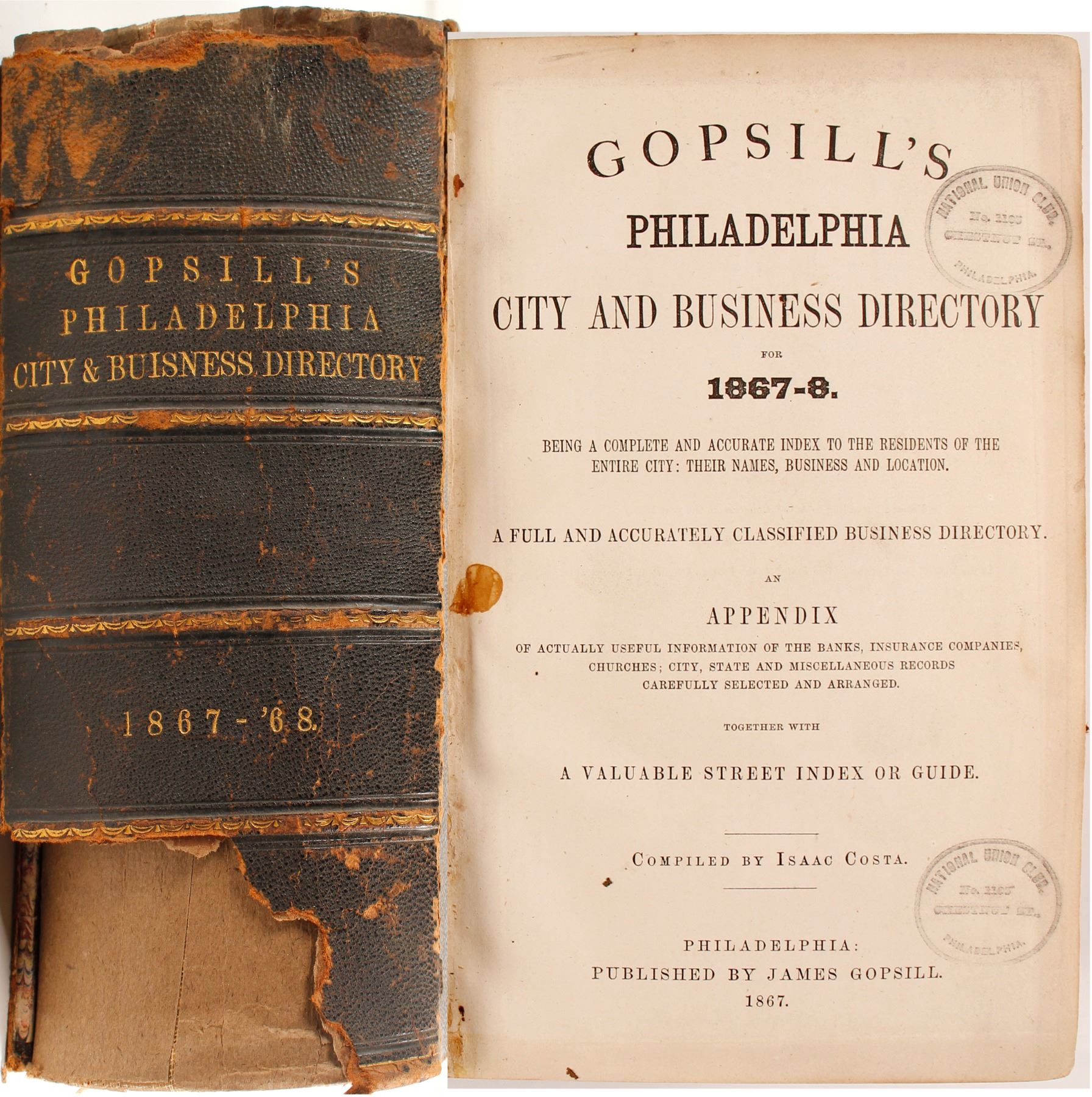 Gopsill’s Philadelphia City and Business Directory for 1867-8, published by James Gopsill, 1867. 1,690 pages and includes a map in the front pocket. Front cover board broken off. Spine cover is loose. Philadelphia Pennsylvania Fred Holabird Collection