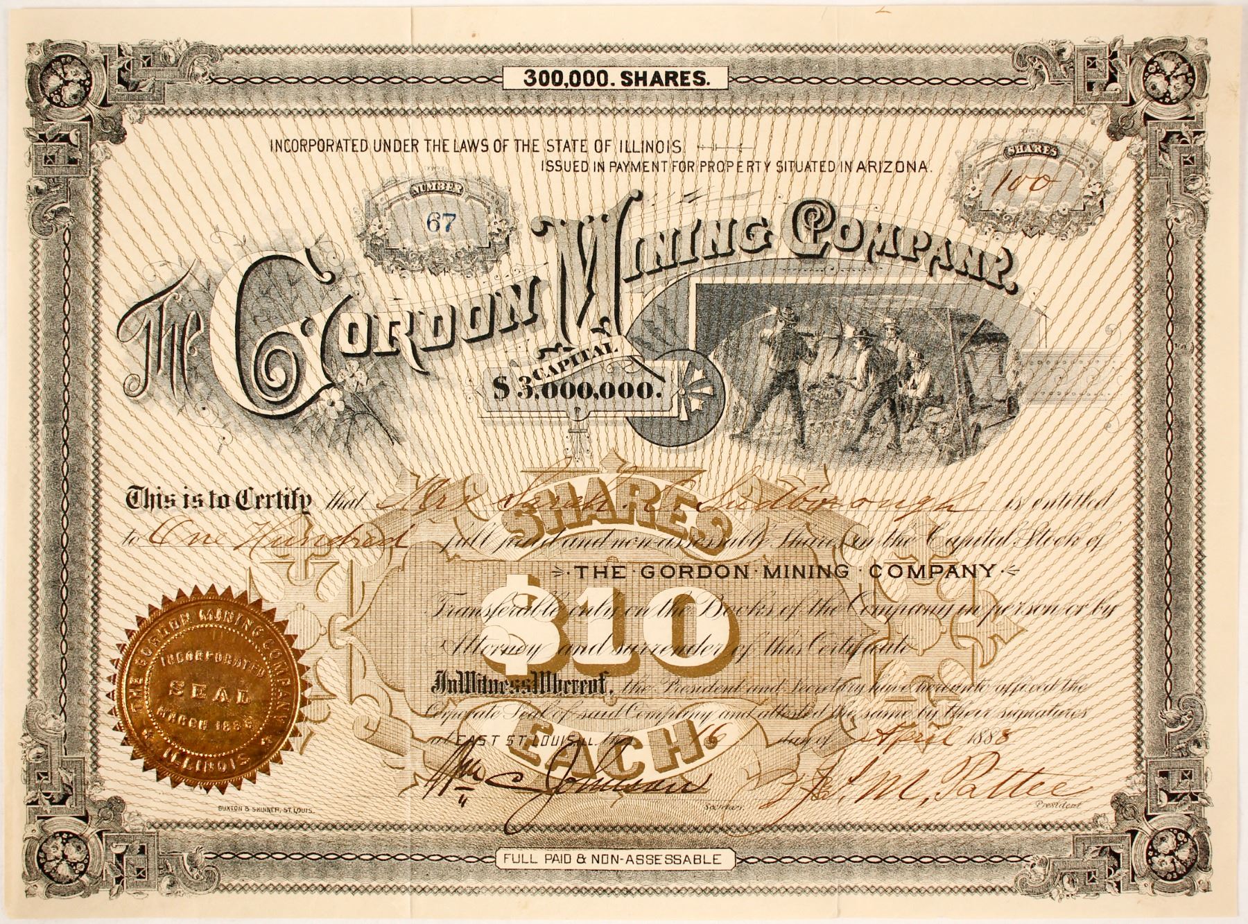 Number 67 for 100 shares to Sarah O Ludborough. Signed by JC Johnson and JM Pattee. Vignette has been worked into the stock below the company name. Nice underground scene of three miners and an ore cart. Crisp brown on light brown safety paper. Spectacular! The Gordon Mining Company developed into a sound, promising property. More impressively, it was under female directorship, rare in western mining. In 1881, Canadian Martha A. Gordon organized the company to speculate. [http://legacy.historycolorado.org] Large size stock. On nick bottom right. Two vertical folds. Bottom left is dogeared. Otherwise this is a bright and clean stock certificate.