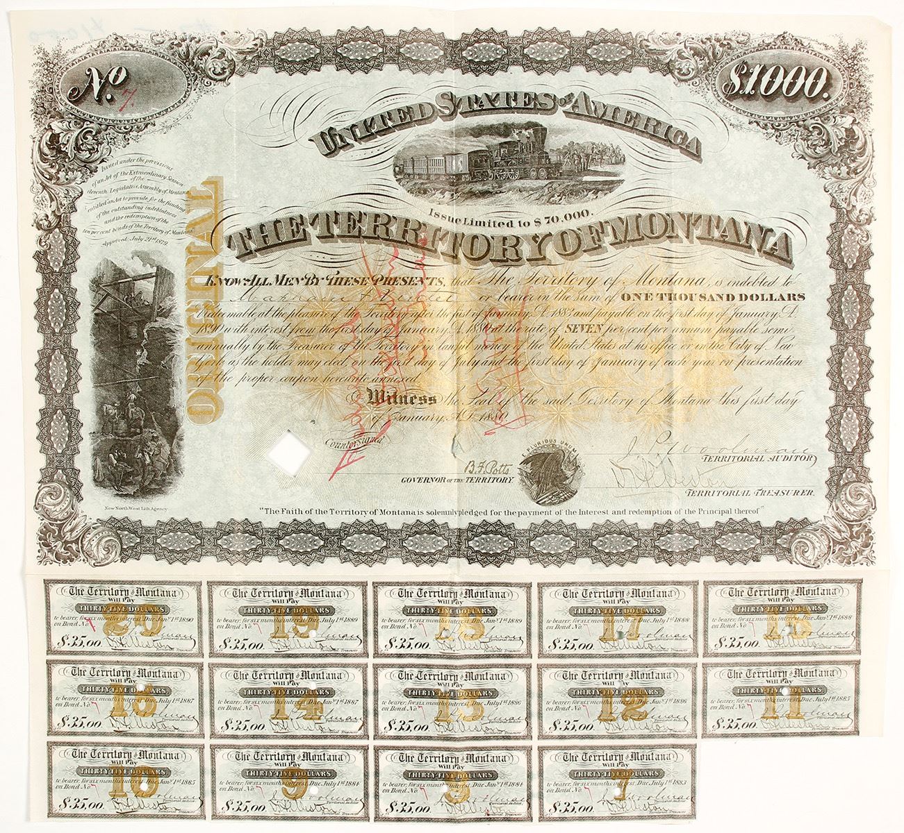 Territory of Montana $1,000 bond No. 7 issued Jan. 1st, 1880. Signed by G.F. Potts, Governor of the Territory and Auditor and Treasurer. Signatures cut cancelled. Gorgeous design: ornate border, green background with gilt, two vignettes (placer mining and locomotive). 14 coupons still attached, punch cancelled. Printed by New North West Lith. Agency. 10.5" x 15.5" Folds, light wear. Overall, very nice condition. Potts served as governor 1870-1883 and was a general for the Union in the Civil War. Date: Location: Montana HWAC# 62760
