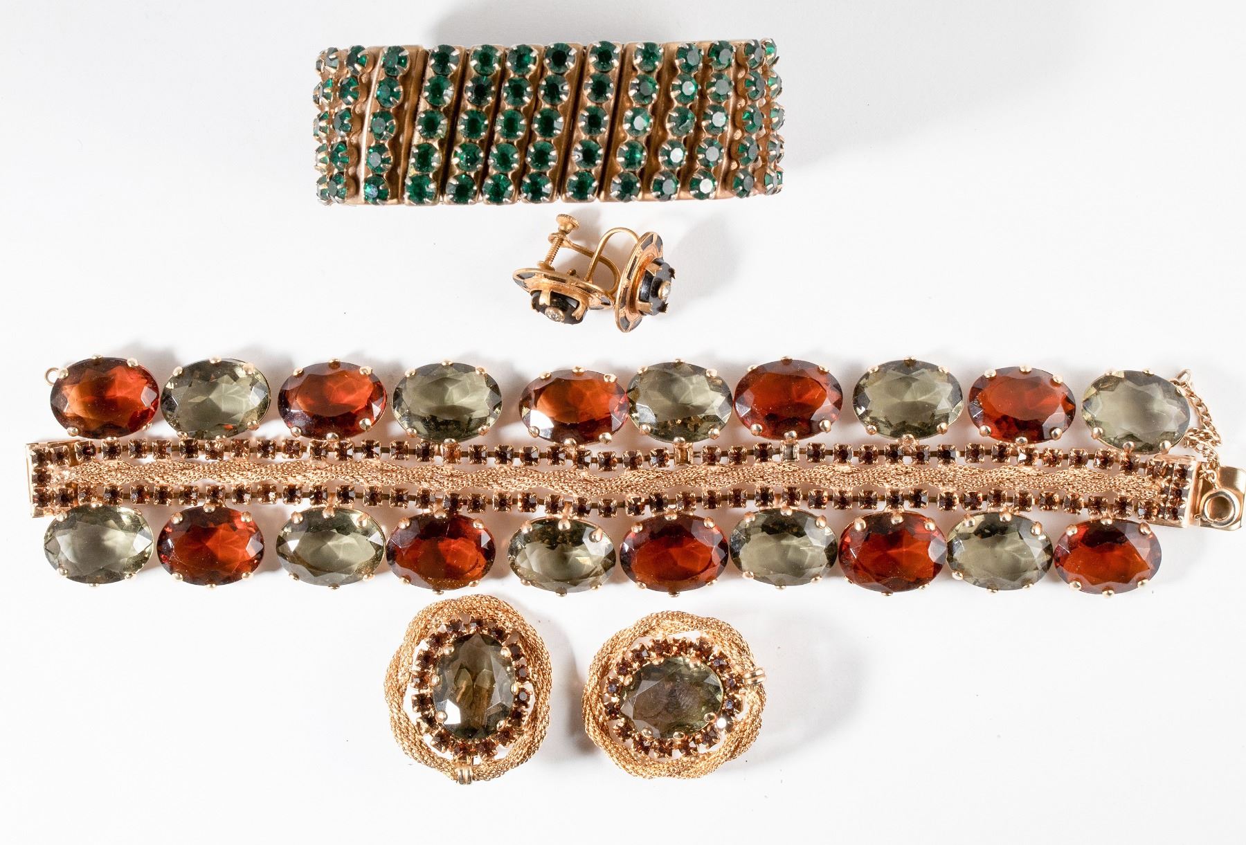 1) Stretch bracelet with Emerald color stones, .5" wide. 2) Bracelet and earrings with braided gold and amber and smoke color stones, 7.5" long x 1.75" wide. Pair earrings to match, clip. 3) Jet and diamond set in gold.5" ovals, screw back. All of these pieces are just beautiful!