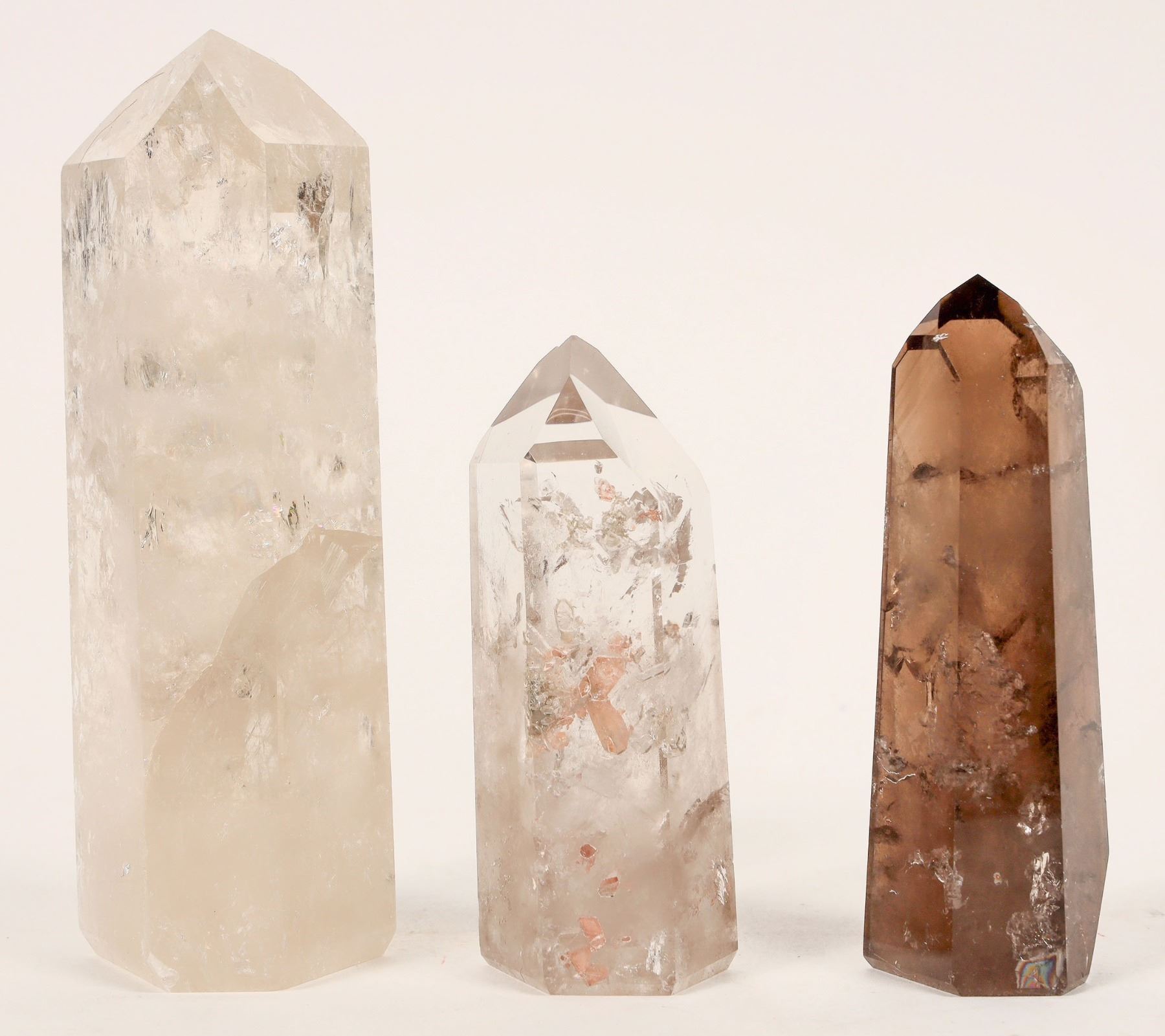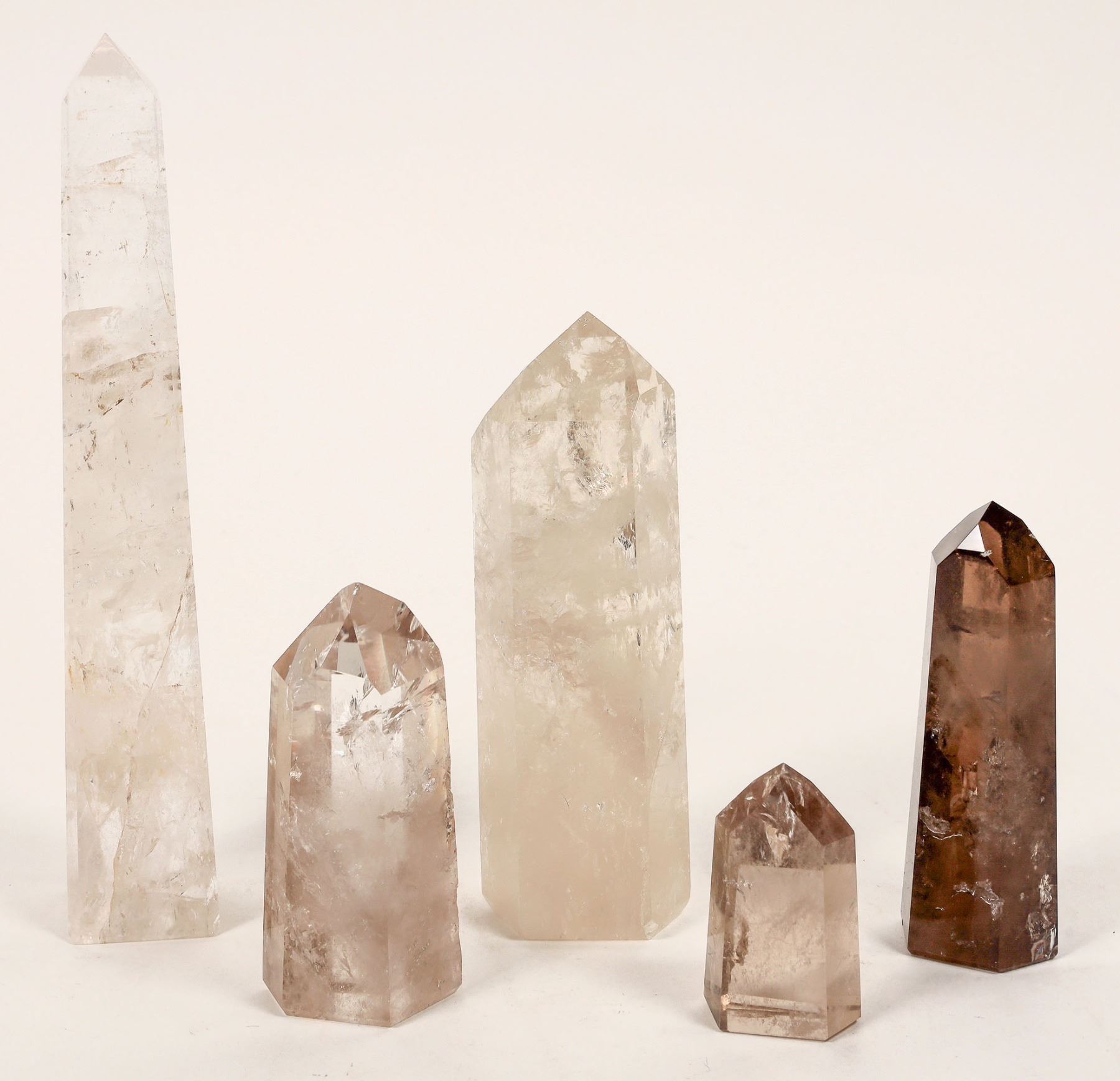 A group of 5 large, gorgeous crystal quartz towers from Brazil. Includes: 10", with 1.5" square base clear quartz with inclusions; 7", with 2" hexagon base clear quartz with rainbow inclusions; 4.75", with 2" hexagon base clear quartz with inclusions; 5", with 1.5" hexagon base smoky quartz with inclusions; and 3", with 1.5" x 1" hexagon base very light smoky amethyst with rainbow inclusions.