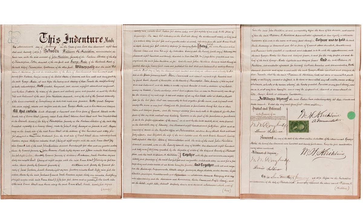Very attractive handwritten deed dated January 17th, 1870. Four pages with very nice R85 adhesive revenue stamp on page three. Measures 17.5" x 11.5"