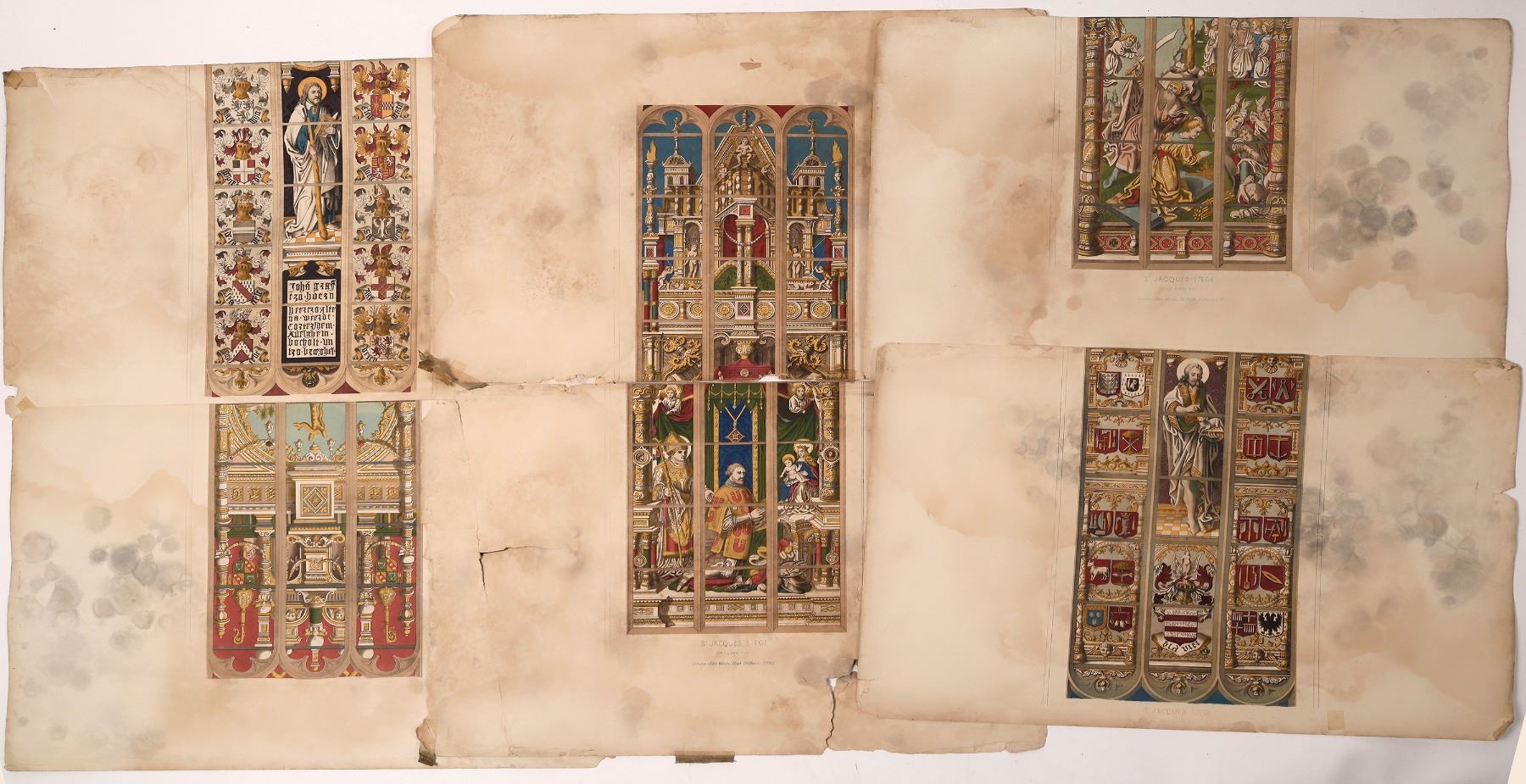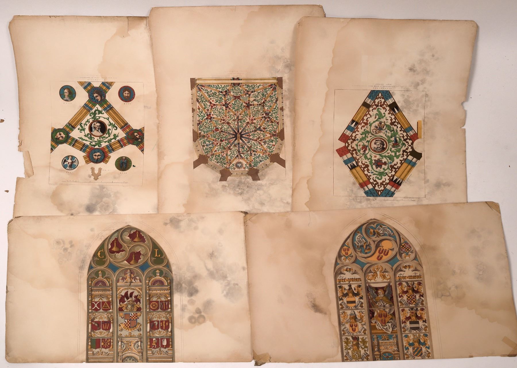 Original 1840s architectural chromolithographs of historic European Gothic Cathedral architecture, stained glass window masterpieces and dome ceiling construction. About 20 different designs, printed on folio size paper 14 in. X 21 in. with actual artwork 6-8 in. X 10-11 in. 6 designs are two pages in size. The original artwork was illustrated by famous architectural artists of the day, printed by famous lithographers, hand colored by the artists and reproduced as chromolithographs. This collection was first published in 1846 by John Weale.