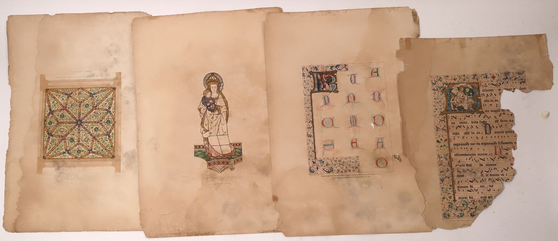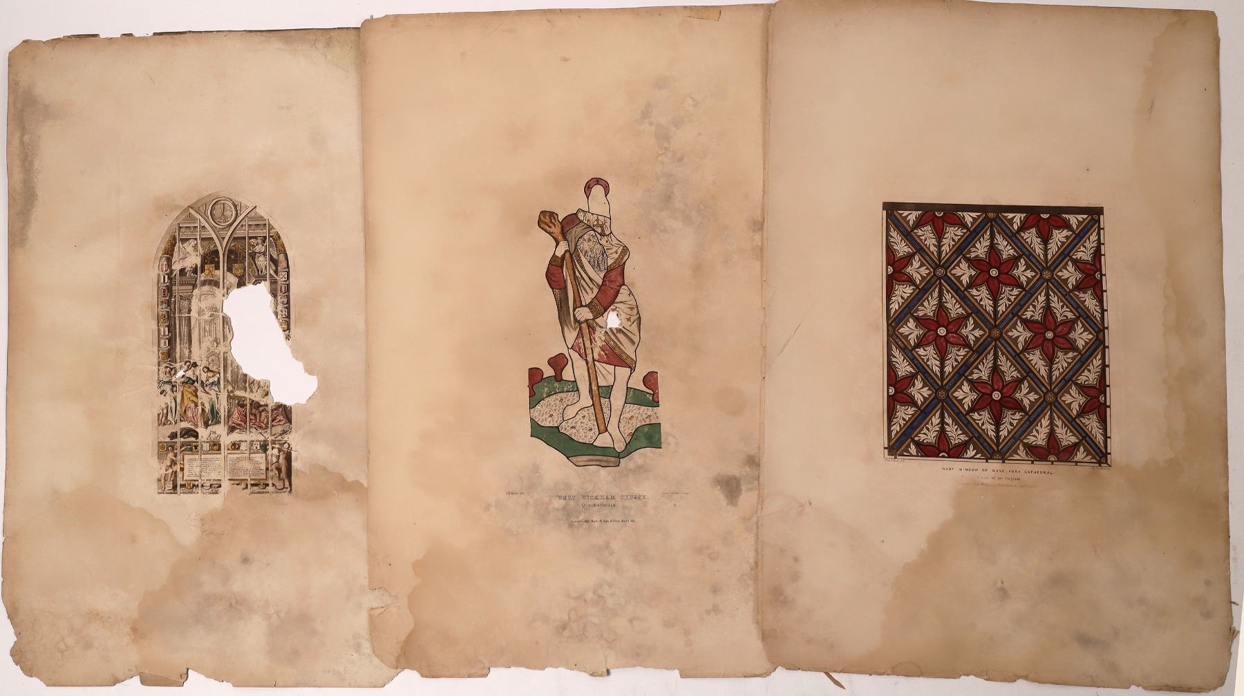 The subject matter represented in this collection covers many genres and categories including History (Gothic and Renaissance), Art History (19th Century Great Britain), Pictorial Works (Lithographs, Chromolithographs, Engraving, 19th Century), Christian Art and Symbolism (Saints), Glass Painting or Stained Glass, Church Decoration and Ornament, and Architecture Detail of Churches in Europe, specifically, Liège, Belgium; Gouda, Netherlands; and Great Britain (Berkshire, Windsor, Yorkshire, York, Kent and West Wickham)