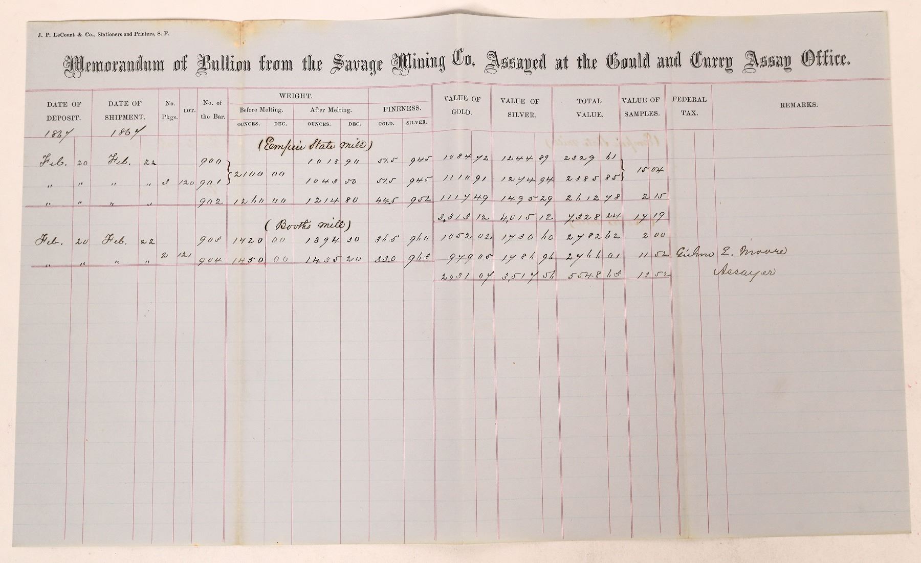 Memorandum of Bullion from the Savage Mining Co. Assayed at the Gould & Curry Assay Office. February 1867. At this point, the Gould & Curry Mine had run out of enough ore to keep their massive mill in operation and were taking in work from other mining companies. This receipt if for five deposits: three from the Empire State Mill, and two from the Booth's Mill. Over 6,000 ounces total, valued at about $7,500. Signed by assayer Gideon E. Moore. Moore studied Chemistry at Yale and then went to San Francisco setting up his own assay office at 612 Sacramento Street by 1863. Realizing the experience and opportunity on the Comstock, he joined as the assayer for the Gould & Curry Assay Office in 1866. Wanting more education in assaying, he went to Europe and received his Ph.D. in chemistry in 1869 from the University of Heidelberg after which he set up a Chemical Laboratory in New York City. The Empire State Mill was in Sixmile Canyon at the foot of Sugarloaf. In 1866, it had 15 stamps and a 15-ton-a-day capacity. Booths Mill was located midway down Sevenmile Canyon. 10 x 17" Blue paper, printed by JP LeCount & Co., SF. Folds with minor separation. Ex. John J. Ford Collection. Very rare.