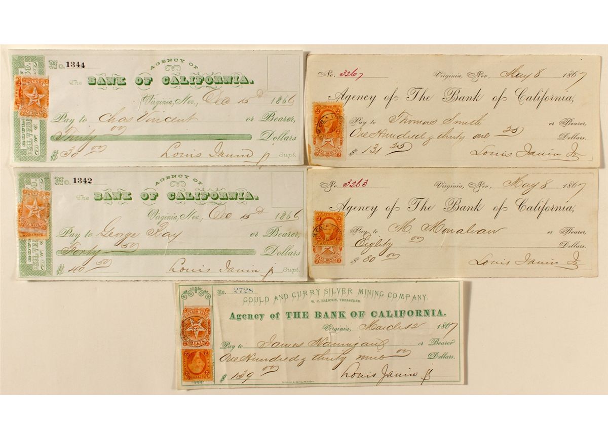 Lot of 5. 1) Two 1867 Bank of California checks signed by Janin with 2 cent US and Nevada revenue stamps attached. 2) Two 1866 Gould & Curry checks with 2 cent Nevada and US revenue stamps (No. 1342 and 1344). 3) 1867 Gould & Curry (different style) check No. 2728 (that lists Ralston as treasurer). Signed by Janin. Two-cent Nevada and US revenue stamps attached. Date Virginia City, NV hwac 20214