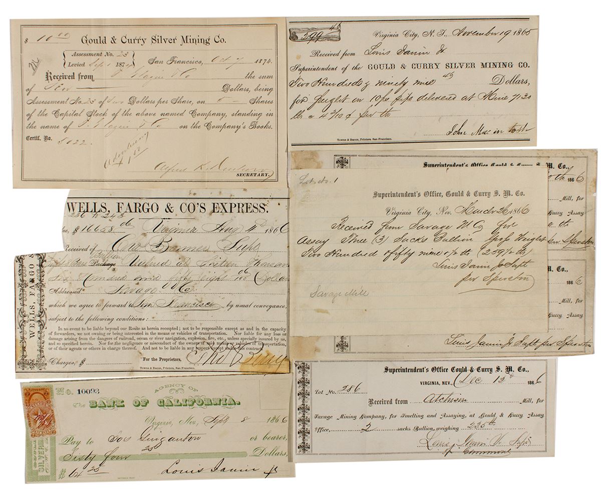 This lot contains six documents relating to the offices of Gould & Curry Silver Mining Company. Included is a assay receipt from the Savage Mining Company, receipts from the Mariposa and Dallas Mills, a receipt from Gould & Curry for $290a check written on the Bank of California for $64, a Wells Fargo & Co. Express receipt for $16,658.06 and a an assessment of $10 from Gould & Curry from an illegible name. There are some tears and folds, but it’s a nice collection.