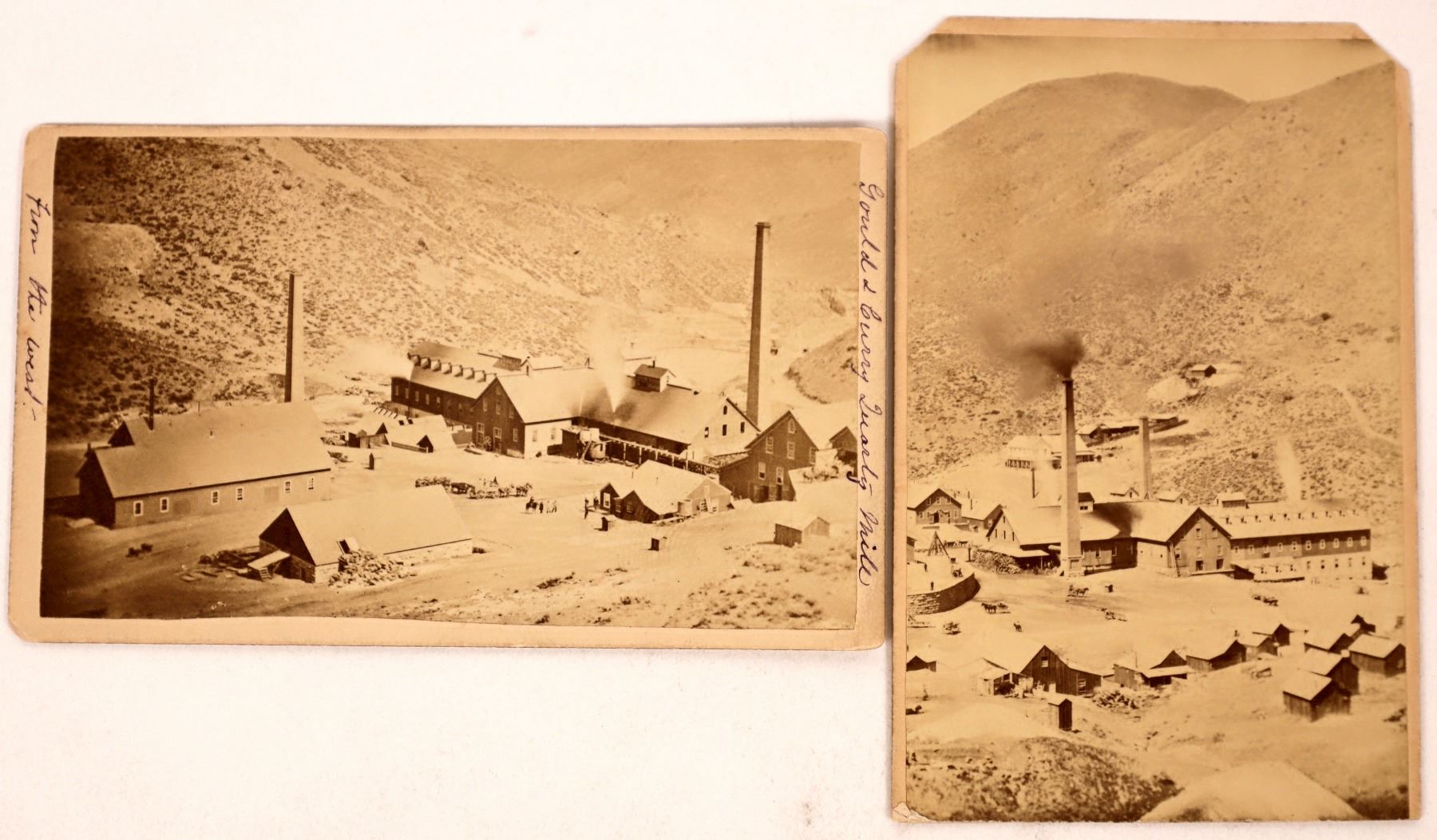 Lot of 2 different early CDVs of the Gould & Curry Mill by Lawrence & Houseworth, c.1864. This mill was built at considerable cost in 1862 and located at the confluence of Sixmile and Sevenmile Canyons. By the end of 1863, approx. $900,000 had been spent. Charles Strong was replaced as supt. by Charles Bonner, and the mill was reconstructed for a cost of $560,000. It used both stamping mills and a variant of the Washoe Pan Process (Veatch Process) along with Spanish style Patio Process. In 1866, it had 80 stamps and a 100-ton-a-day capacity. In 1871, the mill was sold to Parke & Bowie, but shutdown soon after. The Omega Mill was built on the same site in 1876. Comstock historian Elliot Lord had harsh words about the first mill, calling it "the most conspicuous monument of inexperience and extravagance ever erected in a mining district." [Ansari] 1) "723. Gould & Curry Works. General View, From the South." Medium contrast and focus. 2) "724, The Gould & Curry Quartz Mill from the West." 2 cent US IR stamp. Opposite view as other. Good contrast and sharp focus!