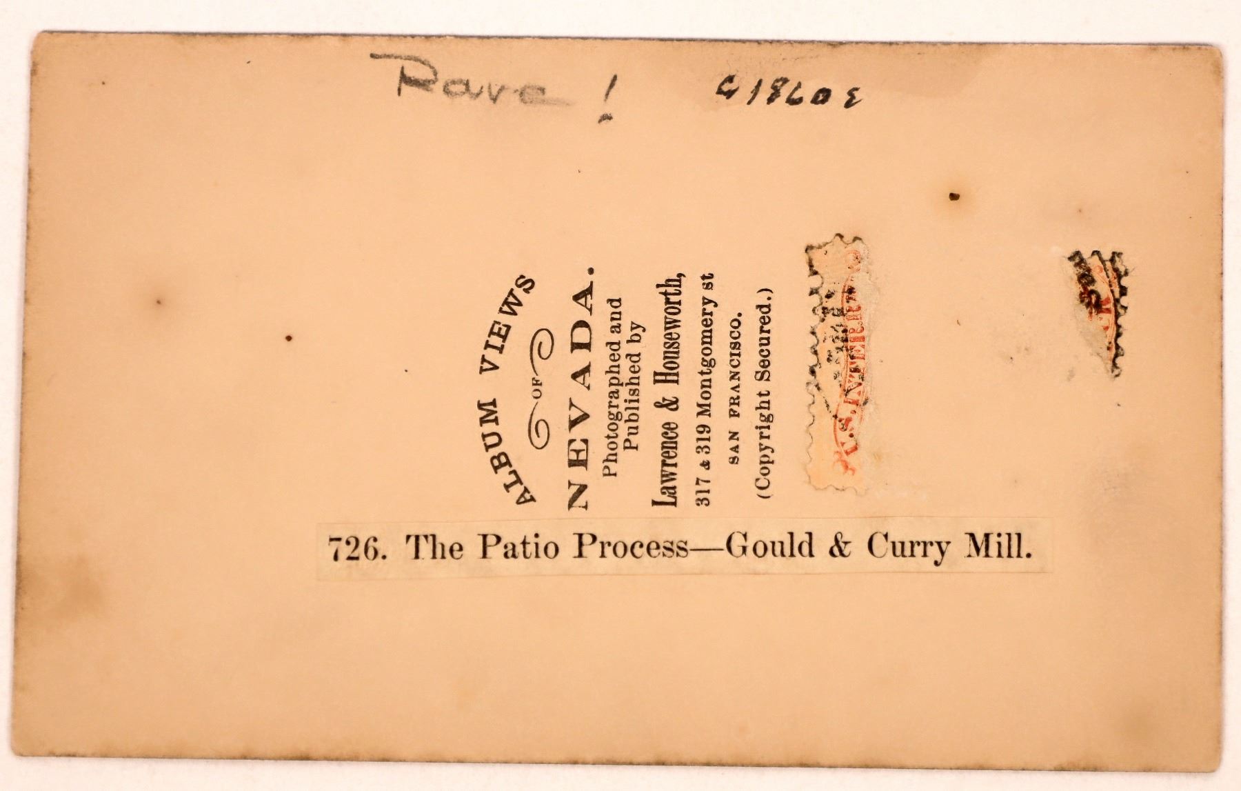 Very rare CDV by Lawrence & Houseworth showing the mill in full production, c.1864. "726. The Patio Process--Gould & Curry Mill." The patios are seen in the foreground. The Spanish used arrastre's to crush the ore from the mine, whereas here the more efficient stamp mill inside the building was used. The Arrastre was driven by a mule or oxen dragging a large rock (dragstone) around in circles over the ore which was spread out on a bed of flat stones. The Patio was large round circular area where mercury, salt and copper sulphate was mixed into the wet crushed ore from the Arrastre. Mules and oxen were again used to slowly mixing in wet crushed ore with mercury and the salts. Remnants of stamp. Great contrast, sharp focus. A choice view.