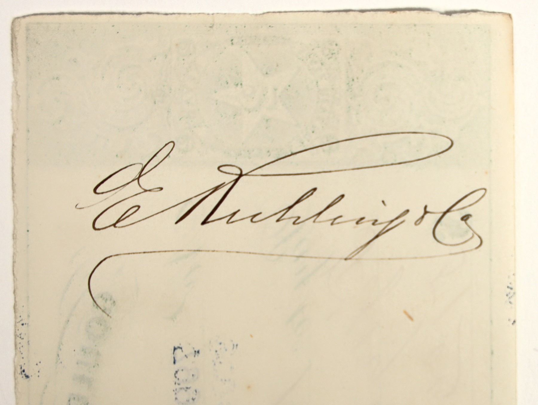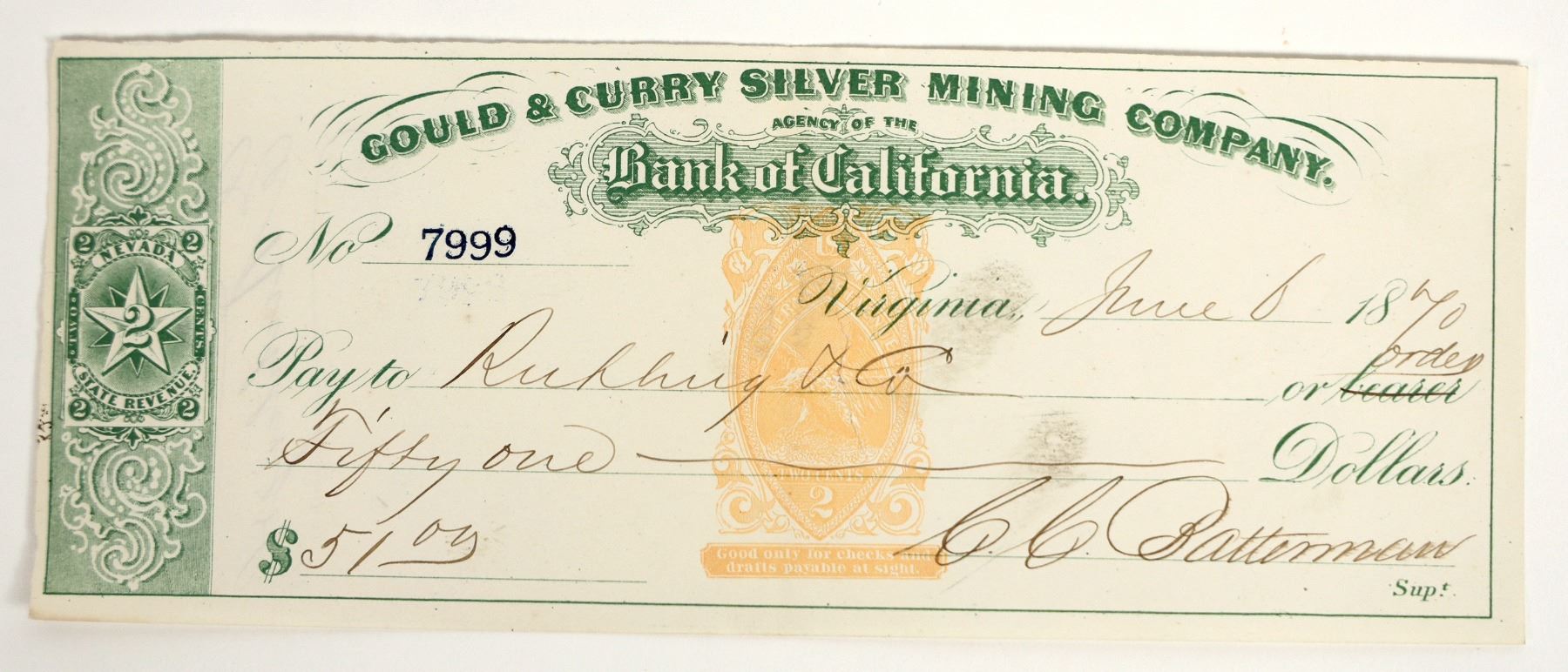 Gould & Curry SMC check issued to Ruhling & Co. in 1870 for $51. Signed by CC Batterman as supt. Endorsed on the back by Ruhling & Co. RN-B and green printed NV revenue stamp. Some soiling. E. Ruhling was an assayer and banker in San Francisco, California, & Virginia City, Gold Hill and Hamilton, Nevada. Ruhling was born in Hamburg, Germany and began to establish himself in San Francisco around 1858. By 1861, he was working and residing in Nevada. His business partner in 1862 was H.V.S. McCullough in the firm of Ed Ruhling & Co Bankers and Assayers in Virginia, Nevada Territory. In 1869, Ruhling operated an assay office at the new silver mining camp of Hamilton in eastern Nevada. Ruhling's business was bought out by McCullough in March, 1871. He returned to San Francisco working as an assayer and joined the Assay Department at the San Francisco Mint by 1878. Ruhling died in San Francisco at the age of 66 in 1898. The Ruhling Assay Office was given the order for making the last (gold) spike for the transcontinental railroad; the original is located at Stanford University.