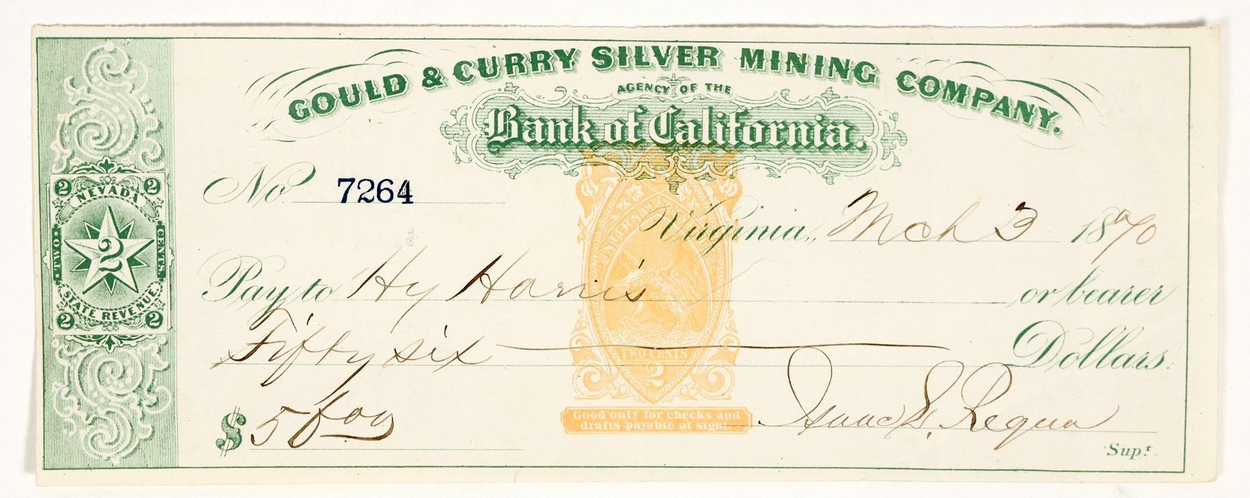 March 3rd, 1870 check issued to Harvey Harris for $50. Signed by superintendent Isaac Requa. RN-B with printed green Nevada revenue stamp. Not signed by Harris. Harvey Harris was born in Denmark in 1814. In the late 1840s, he was working for the US Mint at New Orleans. He came to California in 1852 with his wife and children and started working for the assay firm of Kellogg & Humbert. He also worked for the US Branch Mint in San Francisco in 1854. In 1855, he opened his own assay office in Sacramento with partner Desiree Marchand (from Paris). A year later, they opened an office in Marysville. Both locations were perfect to help process the gold coming out of the Mother Lode, especially the rich Sierra and Butte County mines. Harris established a presence in Nevada at the start of the Comstock Lode (1859). They opened an office in Carson City, then Gold Hill and Silver City. He eventually focused his interests in the Gold Hill office. He died in 1894 and was buried in Carson City.