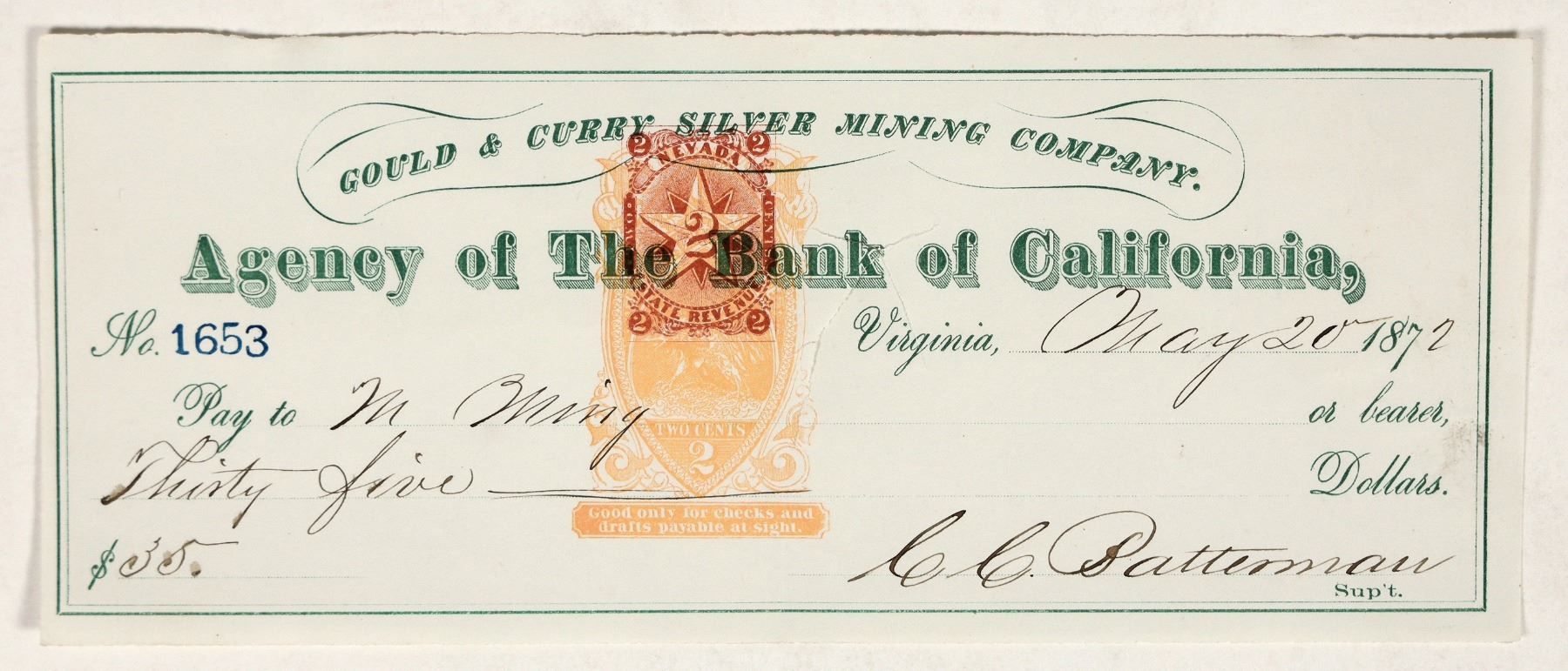 A rare find in the Comstock check archive we have been processing. This 1872 Gould & Curry check is issued to "M. Ming" for $35. Signed by CC Batterman, supt. Not endorsed on the reverse. RN-B17b imprinted revenue. We were unable to find out who this Chinese merchant was, as they are not included in the relevant directories. The Chinese played a crucial role on the Comstock, just as they had in many Western mining camps. Their association with the Virginia & Truckee Railroad was challenged numerous times by white members of the Comstock community.