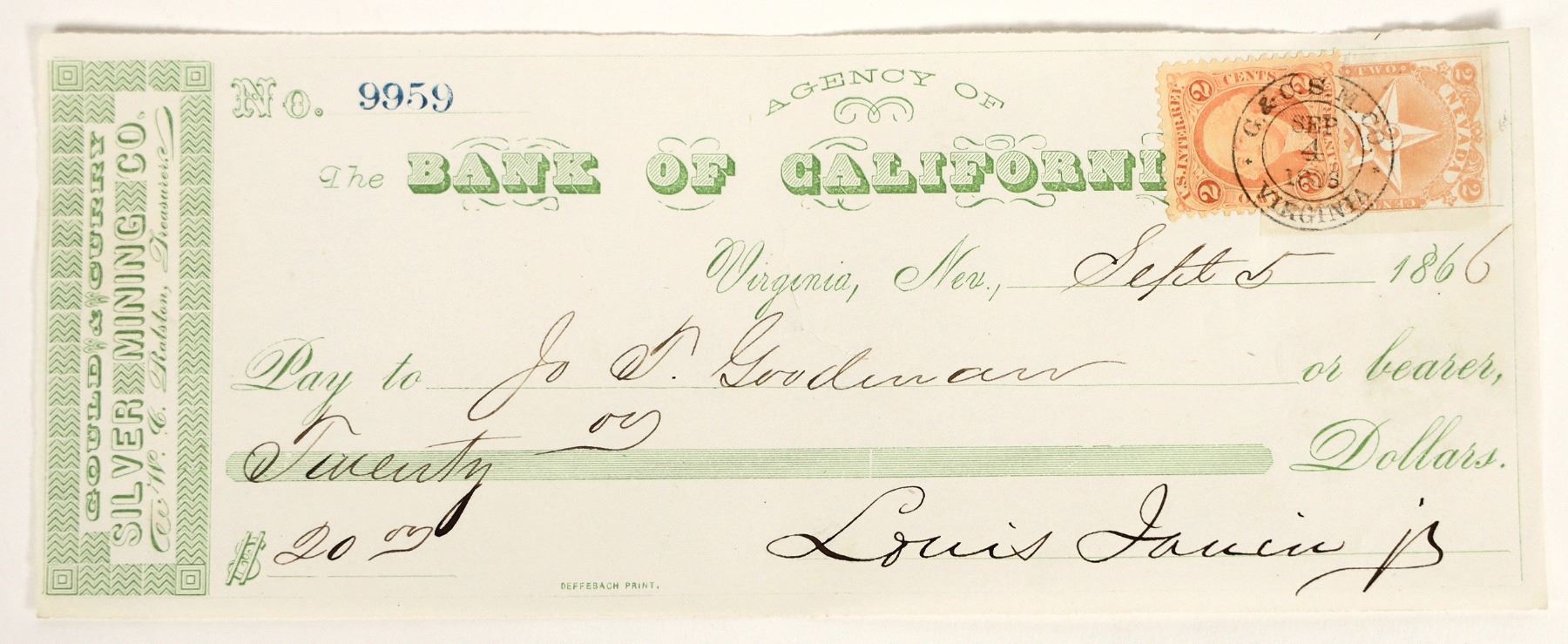 Early G&C check with NV and US IR stamps. Issued in 1866 to Joseph T. Goodman for $20. Signed by Louis Janin Jr. as supt. Goodman was editor of the Territorial Enterprise and friend of Mark Twain. Not signed on the reverse.