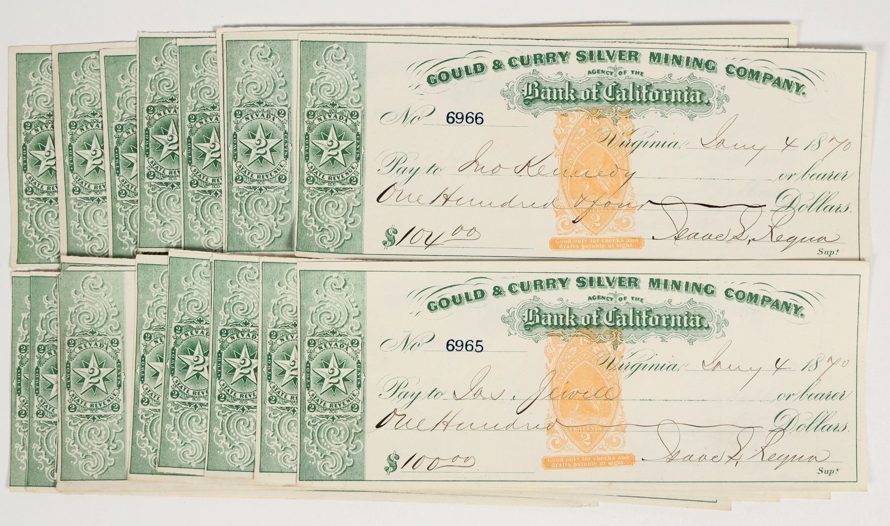 Lot of 20 Bank of California Gould & Curry Silver Mining Company checks issued in 1870. These have RN-B imprinted revenue with green NV stamps printed into the lefthand border. Signed by either Isaac Requa or CC Batterman as superintendent.