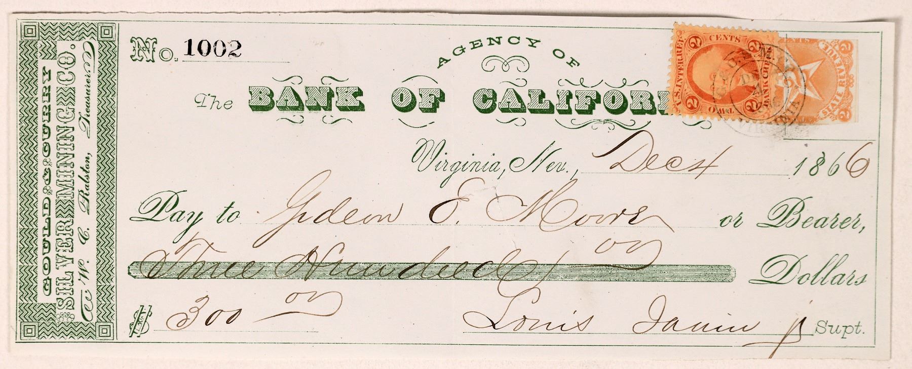 Check no. 1002 issued to assayer Gideon E. Moore on Dec. 4, 1866 for $300. Signed by Louis Janin Jr. as superintendent. Orange 2 cent Nevada adhesive revenue and US IR stamp with tied cancel attached in the upper right. Not endorsed on back. Moore studied Chemistry at Yale and then went to San Francisco setting up his own assay office at 612 Sacramento Street by 1863. Realizing the experience and opportunity on the Comstock, he joined as the assayer for the Gould & Curry Assay Office in 1866. Wanting more education in assaying, he went to Europe and received his Ph.D. in chemistry in 1869 from the University of Heidelberg after which he set up a Chemical Laboratory in New York City.