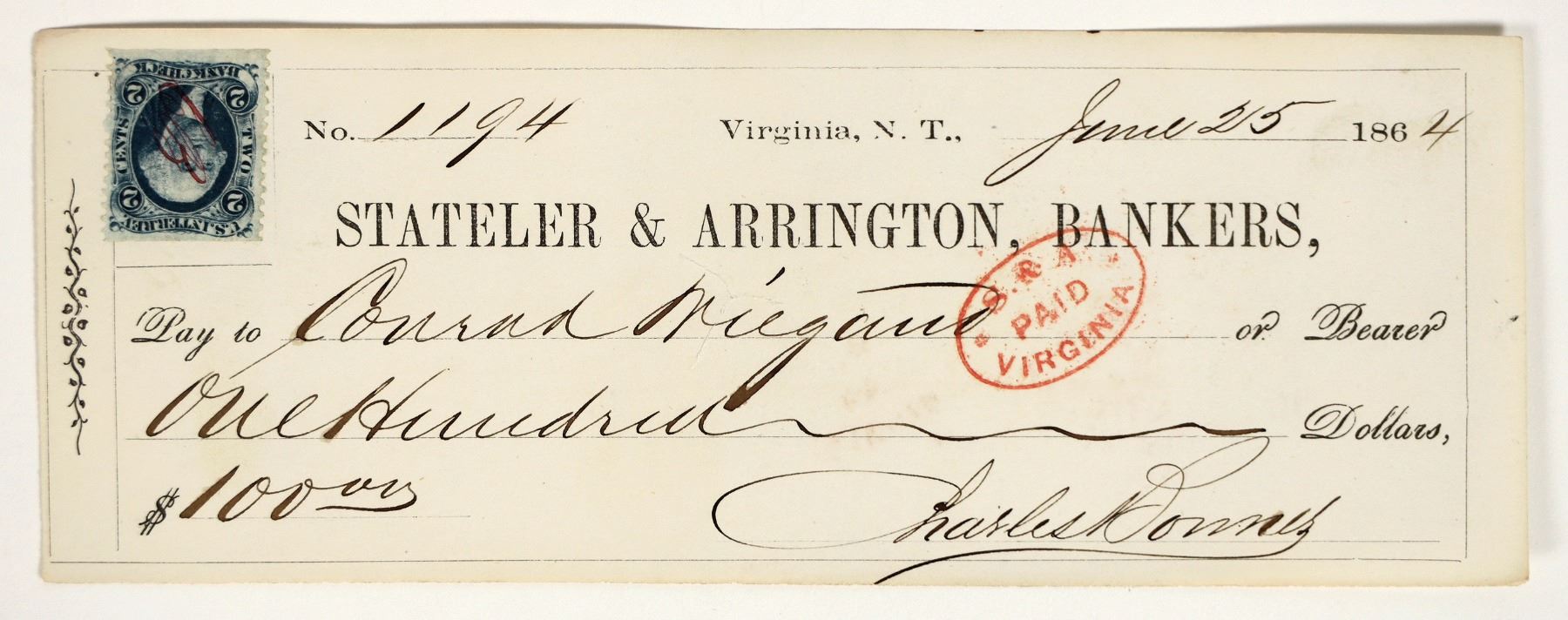 Rare Stateler & Arrington territorial check, June 1864, issued to assayer Conrad Wiegand. Signed by Charles Bonner as supt. Not endorsed on the back. Wiegand worked for the San Francisco Mint in the Gold Rush. He left that job and came to the Comstock in territorial years. He opened his first Comstock office in 1865 in Gold Hill. Wiegand's main concern was for the plight of the small miner and businessman, many of whom were overrun by big business interests. The press, controlled in large part by the Bank of California, suggested Wiegand was crazy and some of the public bought into the idea, though those that knew him said otherwise. In early 1870, Wiegand began publication of the Peoples Tribune, a newspaper he started to further moral issues with the public, including the exposure of fraud and scandalous activity on the Comstock. Always the inventor, as were other members of his family, Wiegand patented a new process for slimes and tailings reduction machinery in 1874. A few years later he was involved in a new mercury and silver separation process. In the mid to late 1870’s Wiegand taught assaying classes in Virginia City that included blowpipe analyses and mineralogy. Wiegand hung himself on June 14, 1880 in his office. Though there were injuries to the body and blood was found in unusual places in his office, his death was ruled a suicide by the Storey County Coroner. He was suffering serious debt, though his wife felt it was under control. He also suffered fits of what he himself considered insanity, and he feared that mental condition as an ultimate fate at old age.