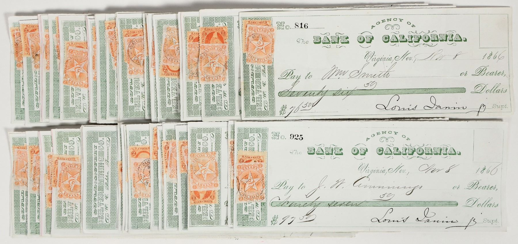 Lot of about 50 Bank of California Gould & Curry checks issued in 1866 and signed by Louis Janin as superintendent. US IR and Nevada adhesive revenue stamps attached.