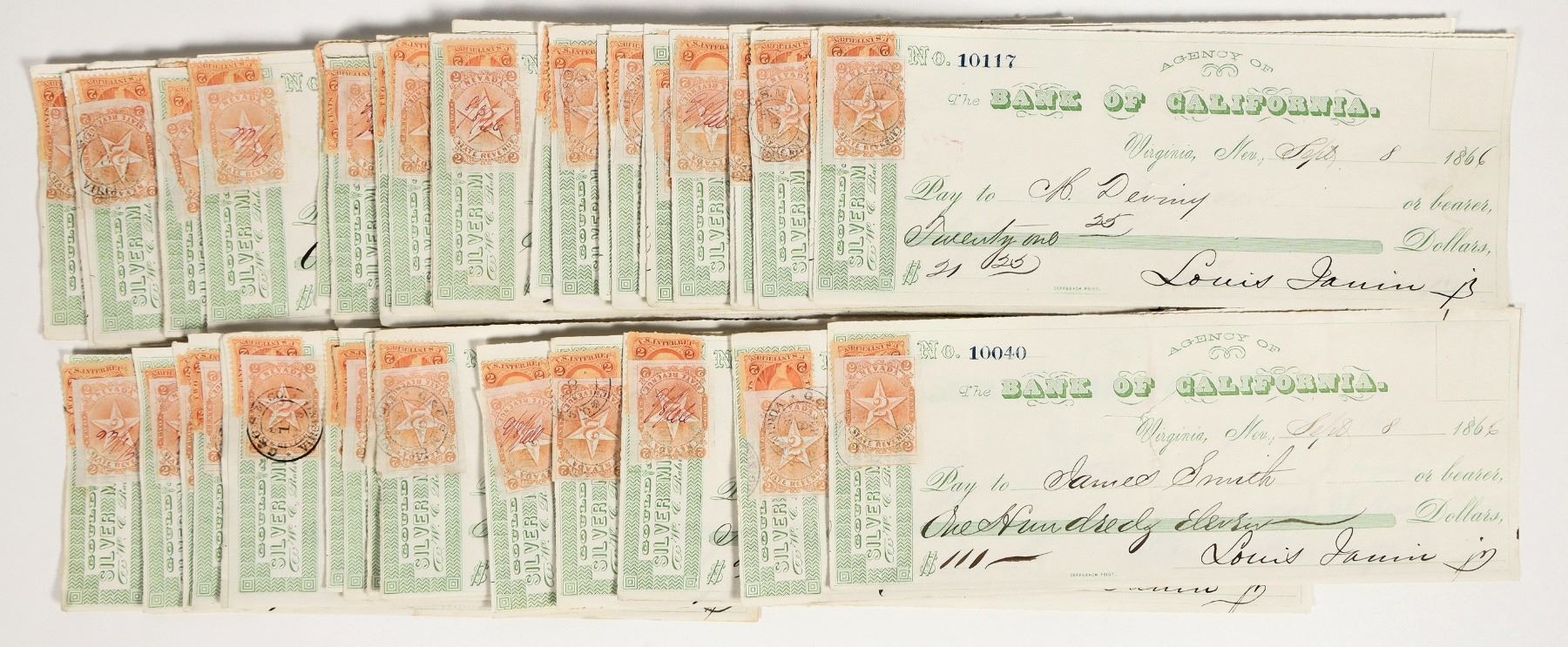 Lot of 50 green style Bank of California checks issued by the Gould & Curry Silver Mining Company in 1866. Signed by Louis Janin as superintendent. All have US IR and orange 2 cent Nevada adhesive revenue stamps. Janin was a prominent mining engineer who was educated at the Freiburg School of Mines. Before coming to the Comstock, he worked for the Enriquita Quicksilver Mine near San Jose, California. He began his work on the Comstock at the Mexican Mill and sought to increase silver extraction that was being lost in the slimes and tailings. Using a modified Freiberg barrel amalgamation process, he was successful in profitably re-working the tailings at the Gould & Curry Mill. He was put in charge of the Gould & Curry Mine in 1866, when it was struggling. (See: https://www.mininghistoryassociation.org/Journal/MHJ-v3-1996-Spence.pdf for a nice history of the Janin family and their many mining projects]