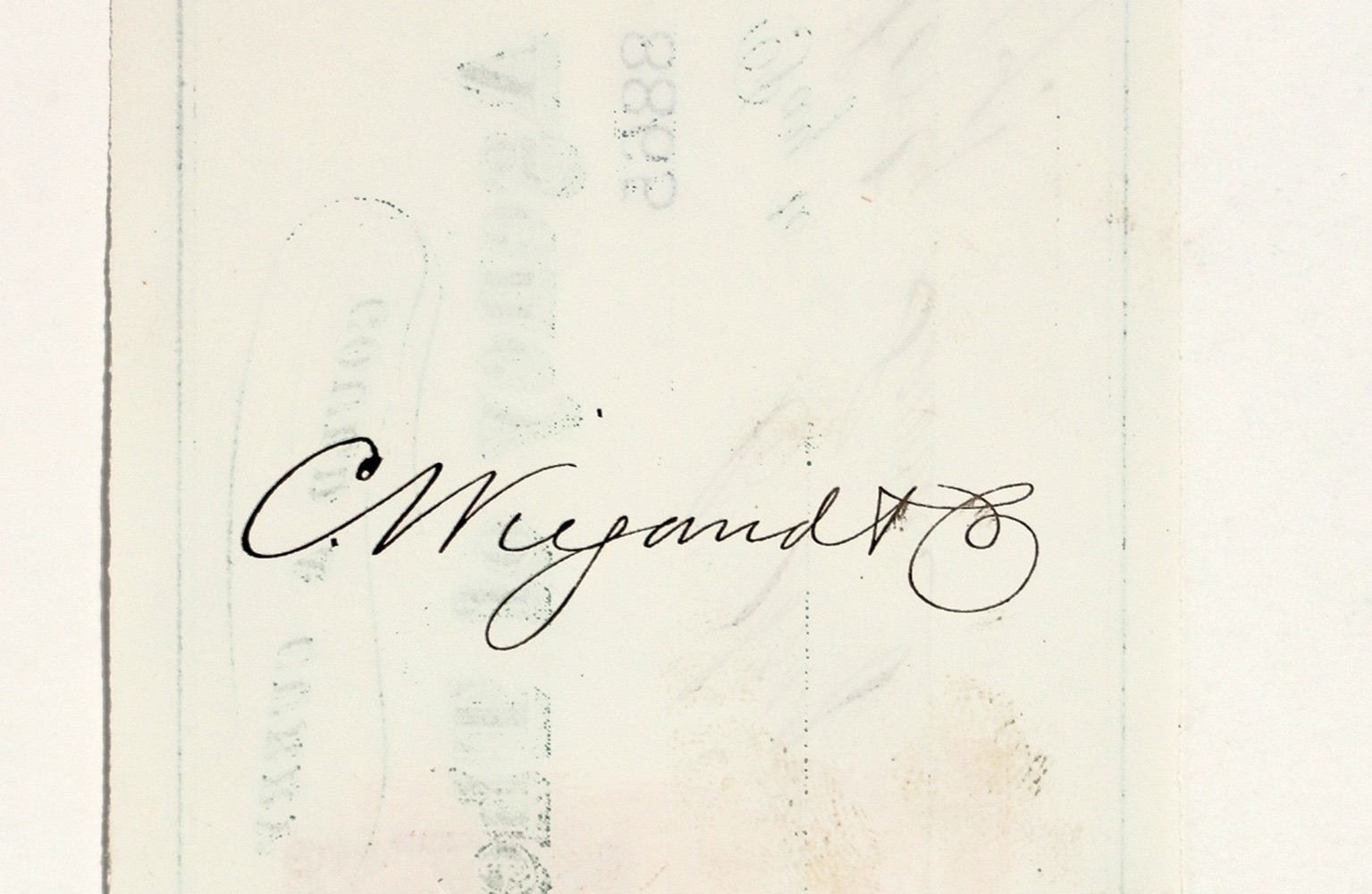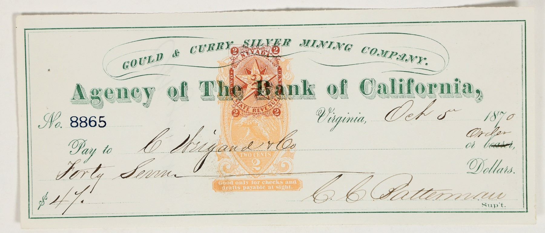 Bank of Cal. 1870 check issued to C. Wiegand & Co. Signed by CC Batterman as mine superintendent. Signed on the back for Wiegand. Rare RN-B17b revenue imprint. Wiegand worked for the San Francisco Mint in the Gold Rush. He left that job and came to the Comstock in territorial years. He opened his first Comstock office in 1865 in Gold Hill. Wiegand's main concern was for the plight of the small miner and businessman, many of whom were overrun by big business interests. The press, controlled in large part by the Bank of California, suggested Wiegand was crazy and some of the public bought into the idea, though those that knew him said otherwise. In early 1870, Wiegand began publication of the Peoples Tribune, a newspaper he started to further moral issues with the public, including the exposure of fraud and scandalous activity on the Comstock. Always the inventor, as were other members of his family, Wiegand patented a new process for slimes and tailings reduction machinery in 1874. A few years later he was involved in a new mercury and silver separation process. In the mid to late 1870’s Wiegand taught assaying classes in Virginia City that included blowpipe analyses and mineralogy. Wiegand hung himself on June 14, 1880 in his office. Though there were injuries to the body and blood was found in unusual places in his office, his death was ruled a suicide by the Storey County Coroner. He was suffering serious debt, though his wife felt it was under control. He also suffered fits of what he himself considered insanity, and he feared that mental condition as an ultimate fate at old age.