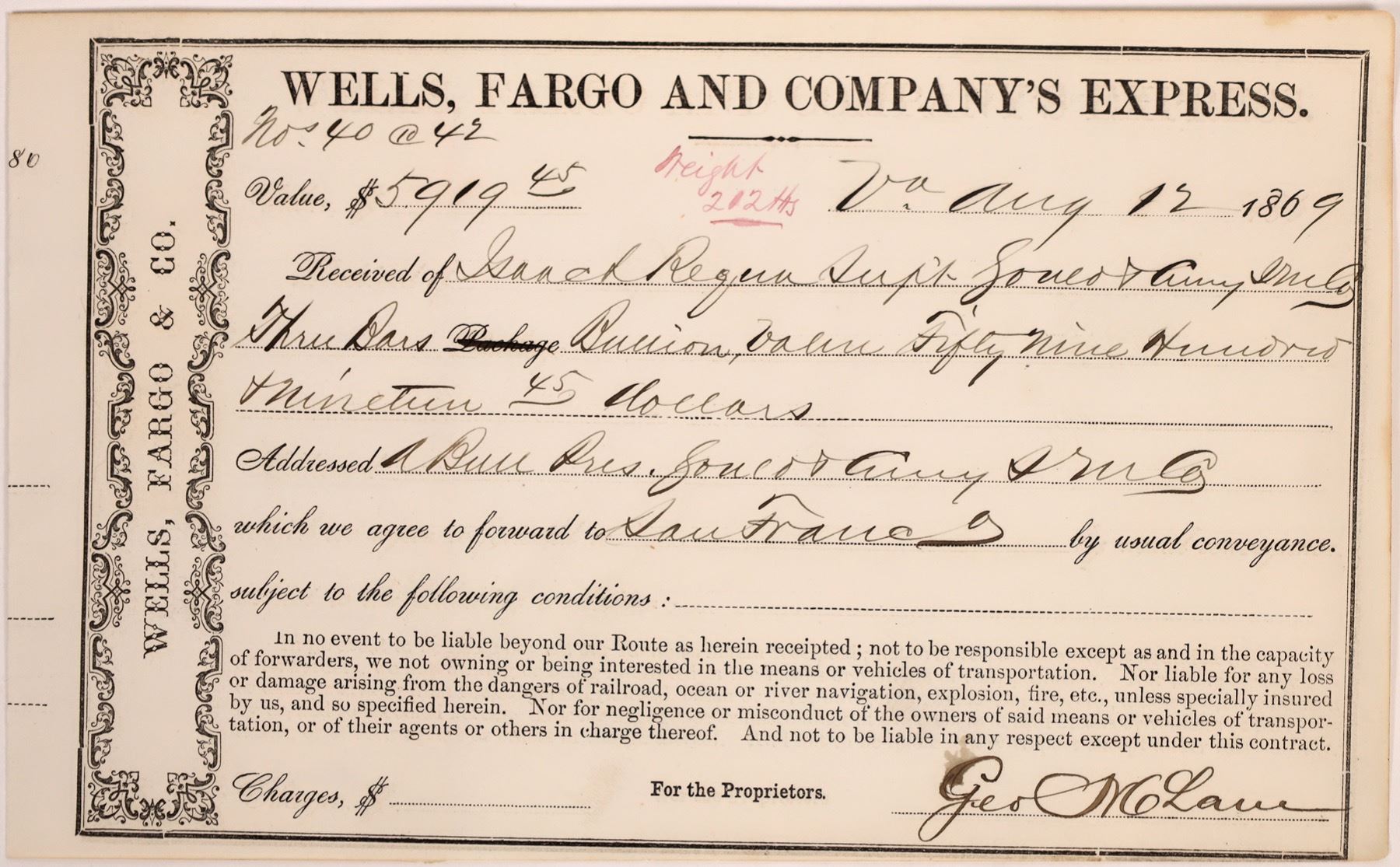 Wells Fargo & Co. Express receipt for three bars of bullion received from Isaac Requa, supt. of the Gould & Curry Silver Mining Co. Valued at $5,919.45. Addressed to Alpheus Bull, president of the company in San Francisco. Dateline Virginia (City), Aug. 12, 1869. Signed by agent McLane. 5.5 x 11.75" with stub. City:Virginia City State:Nevada Date:1869