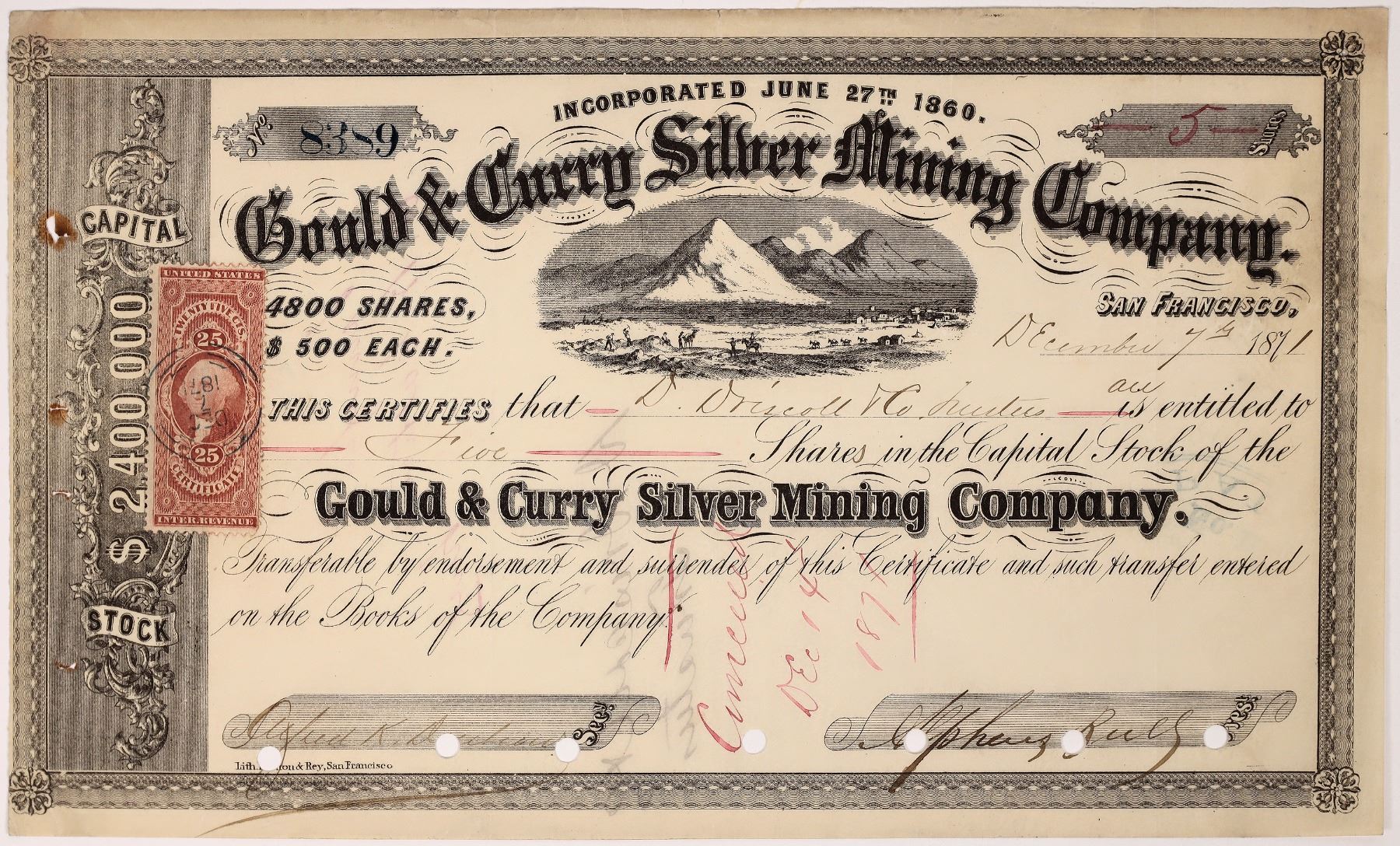 Gould & Curry Silver Mining Co. Certificate - Virginia City, Nevada, Storey County. Cert #8389. Issued to D. Driscoll, Trustee for 5 shares on December 7th, 1871. Signed by Alpheus Bull president and Alfred K. Durbrow, secretary. Incorporated on June 27th, 1860, and capitalized at $2,400,000; 4800 shares at 500 each. Vignette of Mt. Davidson at center. Adhesive 25-cent Internal Revenue “Certificate” stamp at left. Cancelled. Black border on white paper. 6 x 9. The Gould & Curry is located between the Savage and Best & Belcher mines in the central part of the Comstock Lode. It was located in early 1859 as one of the first claims. It is named after Abraham Curry, one of the first settlers into Carson City, and Alva Gould. Both men sold out their interest in the claim for an aggregate sum of less than $10,000. The company was one of the first major mining companies to build their own mill, two in 1861 and one in 1863. The stock rose to $6300 per foot in June 1863, or about $1600 per share, after Comstock mine production went from $6 million in 1862 to $12 million in 1863. Among the original incorporators were George Hearst, Lloyd Tevis, John Earl, Alpheus Bull, Thos. Bell, A. Head, B.F. Sherwood, and Wm. Blanding. William Chapman Ralston was appointed treasurer, Alpheus Bull the President and Charles L. Strong the mine superintendent. Alpheus Bull was an original 49'er and was president of a number of mining companies and involved with a several of insurance firms, including Vice President of the Fireman's Fund. Strangely, he like Ralston met their end drowning. Virginia City Nevada Franklin Collection