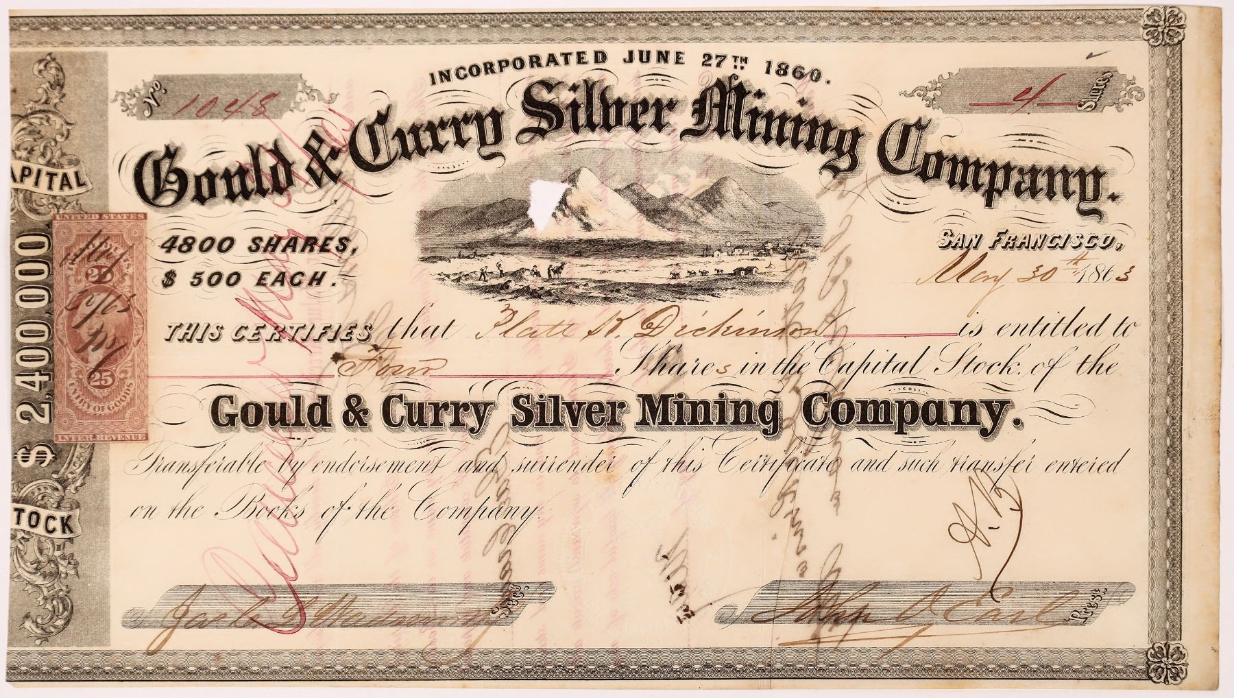 Gould & Curry Silver Mining Co. Virginia City, N.T. Incorporated in 1860. Cert #1048 issued to Platt K. Dickinson for 4 shares 0n May 30th, 1863. Signed by John A. Earl president and Jas. C. L. Wadsworth secretary. Vignette of Mt. Davidson at center. Adhesive revenue on front. Cancelled. Black border on white paper. 6 x 9."Trimmed tight at left end. Wadsworth came to California in 1847 from New York. He was an alcalde in Stockton in 1849, and a resident of San Francisco after that. (Alcalde is a Spanish term for a Sheriff or Justice of the Peace. It was an office with slightly different duties than today. Alcaldes were one of the important law enforcement officers of the period.) Bancroft said he was a 'well known mining man." He is listed in 'mining" in later S.F. directories, residing at the Grand Hotel. John O. Earl was handpicked by Hearst and Tevis to run the company, which he did from his San Francisco office. He was responsible for the huge assessments that were levied in 1862 that brought in the money necessary for the exploration that found the bonanza ore body. He was later a director of the San Francisco and Colorado River Railway Co., which had been formed to purchase the Central Pacific RR, but the Stanford gang would have northing of it. Smith lists Earl right behind Hearst as one of the Comstock millionaires who gained his fortune from the G&C. He listed himself as a 'capitalist" in 1875, and in 'mining" in 1881. Curiously, he is not in each annual S.F. directory. Little else has been written on Earl, who seems to have retired from the presidency of the G&C after the big bonanza was hit and lived a life of relative ease. When this certificate was issued, it was bought at the top of the market, costing Dickinson nearly $6000 for his four shares. This and two other pieces are the only surviving certificates from this famous mine with Earl's signature. [Ref: Smith, Lord, King, Langley's S.F. Directories; Bancroft]. The Gould & Curry is located between the Savage and Best & Belcher mines in the central part of the Comstock lode. It was located in early 1859 as one of the first claims. It is named after Abram Curry, one of the first settlers into Carson City, and Alva Gould. Both men sold out their interest in the claim for an aggregate sum of less than $10,000. They were one of the first major mining companies to build their own mill, two in 1861 and one in 1863. The stock rose to $6300 per foot in June 1863, or about $1600 per share, after Comstock mine production went from $6 million in 1862 to $12 million in 1863. Among the original incorporators were George Hearst, Lloyd Tevis, John Earl, Alpheus Bull, Thos. Bell, A. Head, B.F. Sherwood, and Wm. Blanding. William Chapman Ralston was appointed treasurer, and Charles Strong the mine superintendent. Strong had originally come to Virginia City. A small piece is missing from the vignette in the sky above.