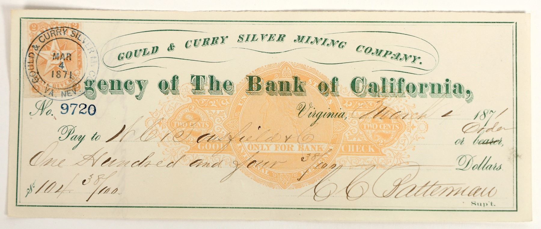 Gould & Curry Virginia City, Nevada Check Issued to Assayer WC Bousfield [199021]