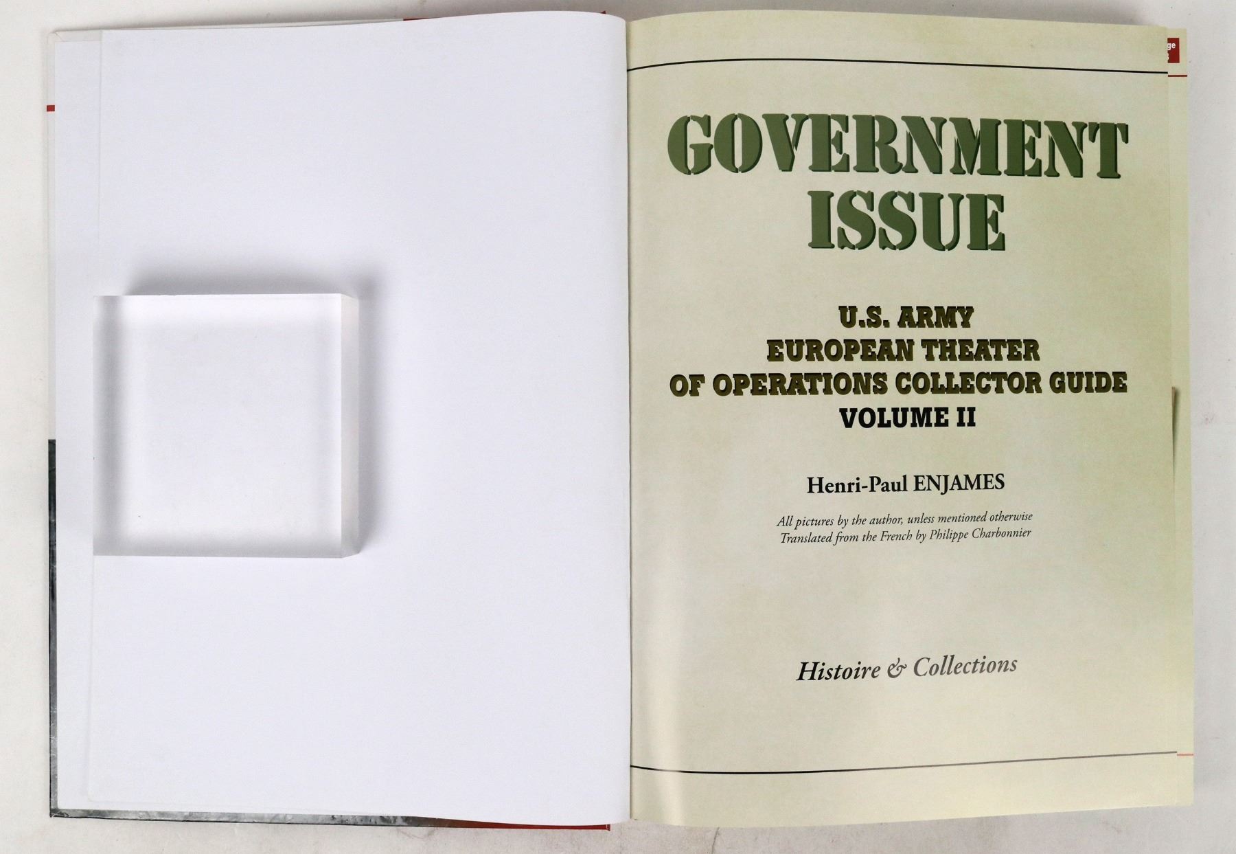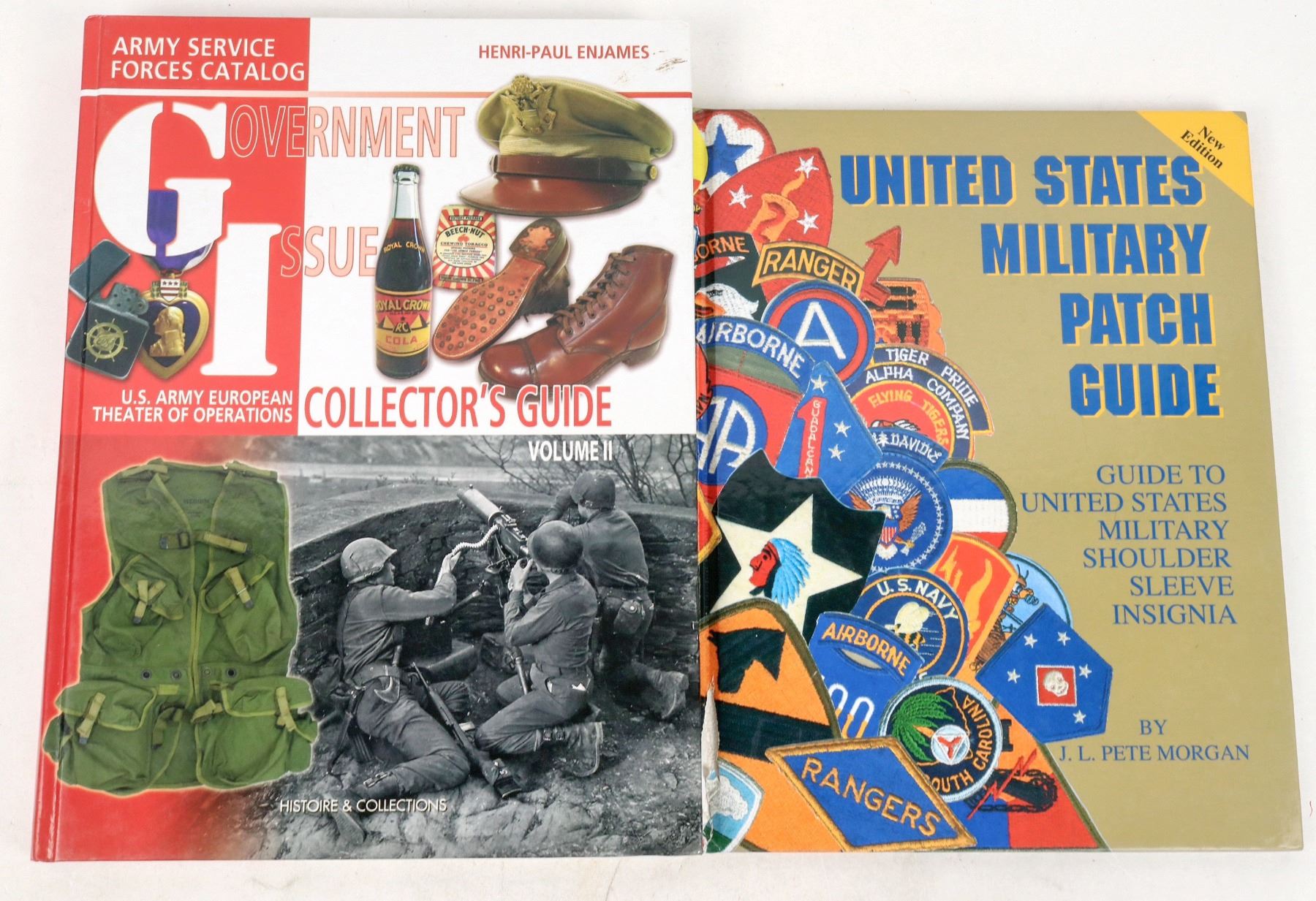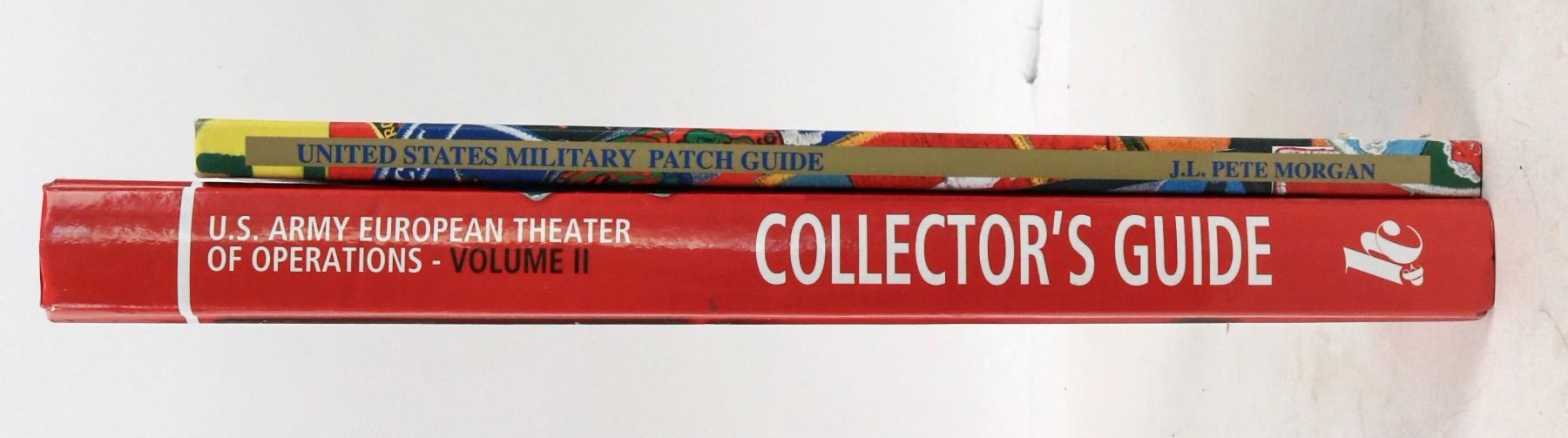 This lot has two books: "Government Issue: U.S. Army European Theater of Operations Collector Guide: by Enjames and "United States Military Patch Guide" by Morgan. Government Issue: U.S. Army is pp.272 well researched and with color photos Volume 2 in excellent condition no DJ. U.S. Military Patch Guide is at pp.115, full color photos and no DJ in very good condition.