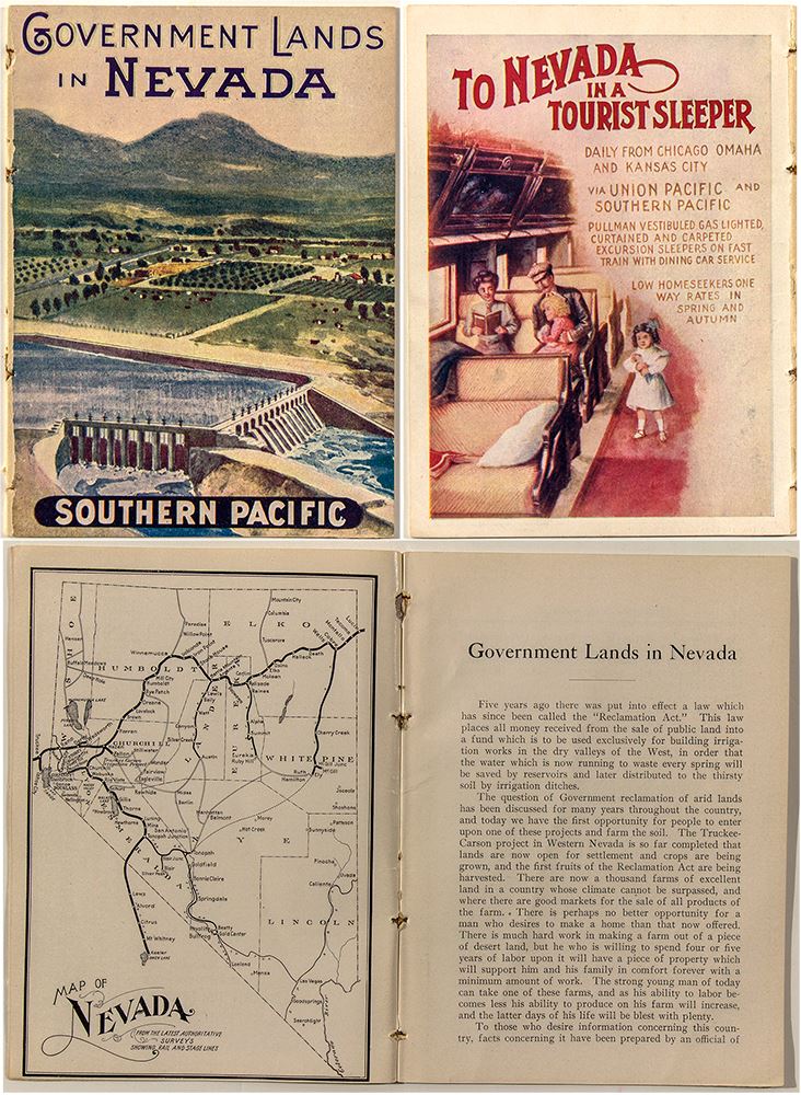 Booklet about "Government Lands in Nevada" published by Southern Pacific Railroad Company. The booklet (6.5" x 4.5") describes how to secure a homestead, farming and agriculture, ranching, with photos and train routes.