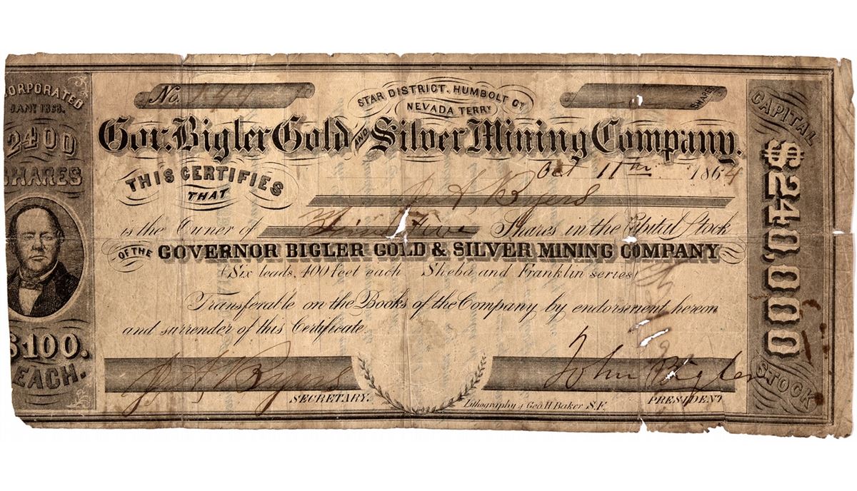 Incorporated in 1863. Certificate No. 144 issued in October 11, 1864 to J.A. Byers for 5 shares. Signed by secretary J.A. Byers and president John Bigler. U/C. Printed by Lithography of George H. Baker. Certificate measures 8.25"x4". Stock is worn along edges and has some minor tearing on the edges and in the center along a fold line. Lefthand side has a close crop, cutting off some of the words and letters. John Bigler was a big name in California. Not only was he the first governor two serve two consecutive terms, but he was also responsible for the moving of the capital to Sacramento and the development of the railroad from Mississippi to the Pacific Ocean. Bigler was so well-loved that a lake was named after him. That lake has since been renamed Lake Tahoe [http://www.nga.org].