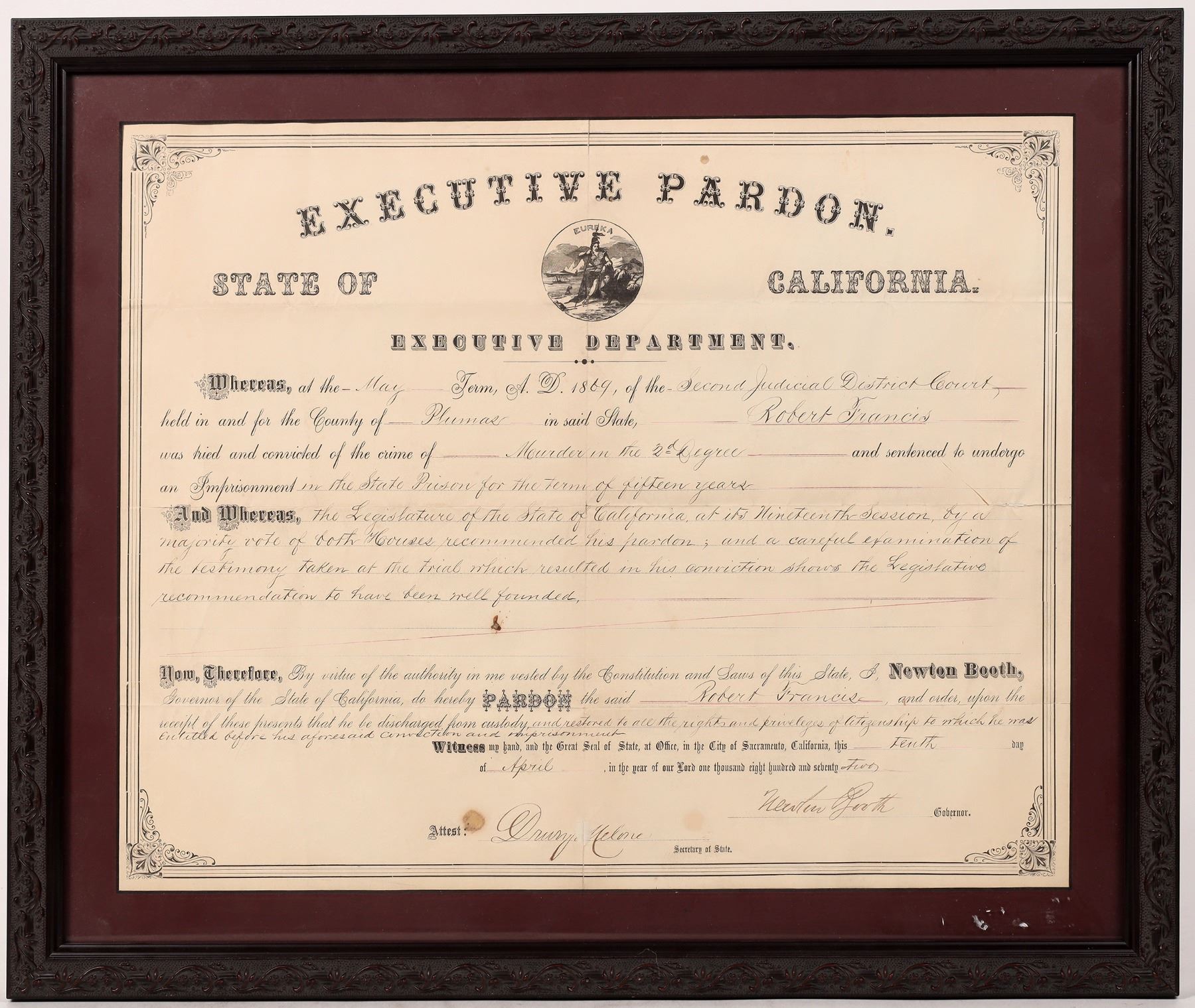 An appeal to Governor Henry Haight fell on deaf ears and it wasn't until Francis' attorney and a few influential friends applied pressure, did the California Legislature vote to give Francis the pardon he sought for three (3) years. It was signed by Governor Newton Booth and his Secretary of State Drury Melone.