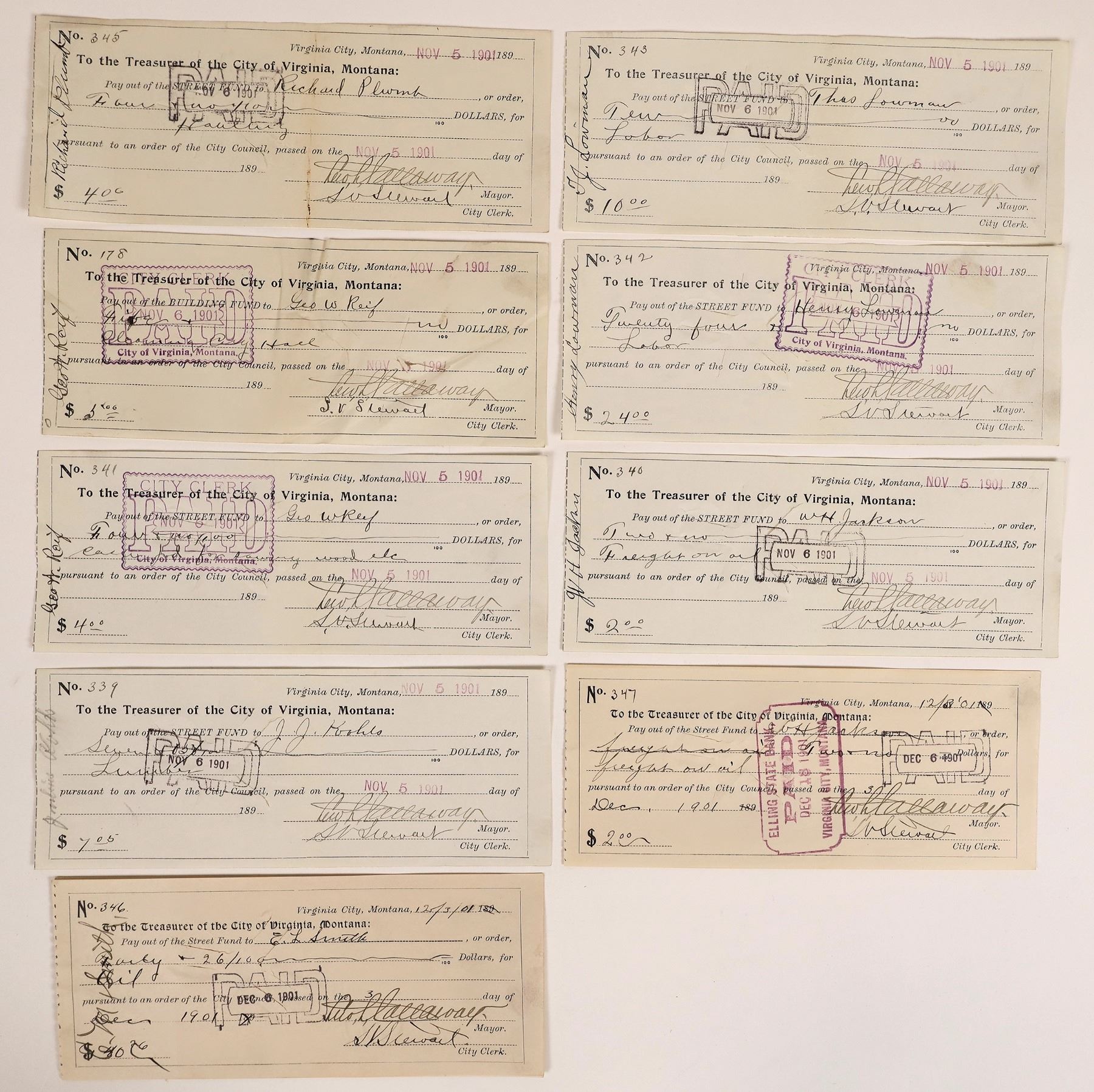 Lot of ten cut cancelled checks drawn on the Building Fund of the Treasurer of the City of Virginia, Montana issued in 1901 and signed by the mayor, Llewellyn Link Callaway (elected 1900 and served three terms) and the governor, S. V. Stewart. Samuel Vernon Stewart (1872-1939) was an American attorney and Montana State Representative, Montana Supreme Court Justice and the sixth Governor of Montana from 1913-1921.
