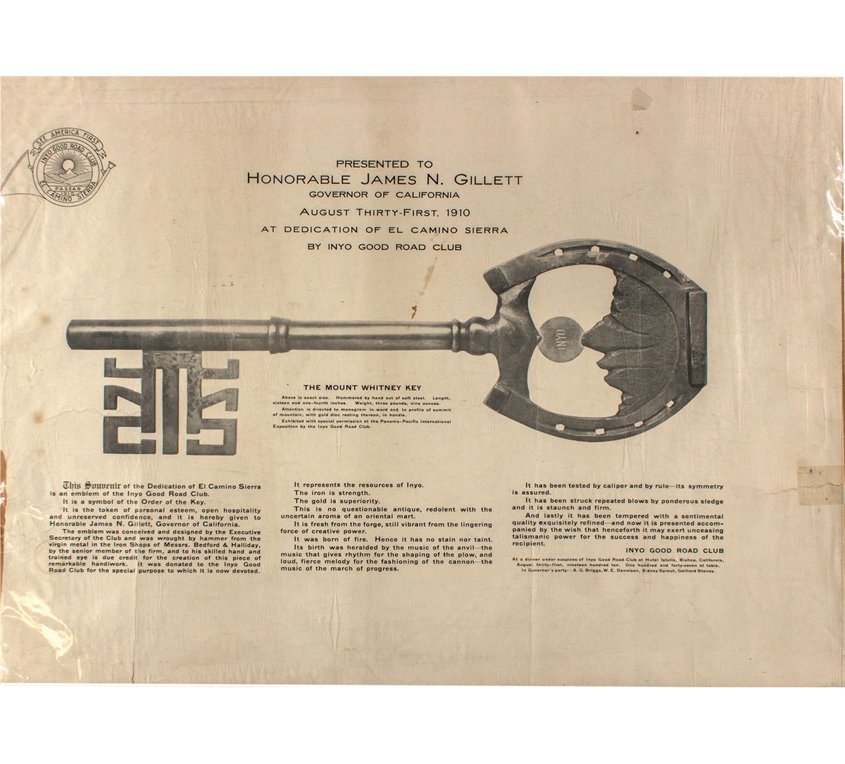 21 x 16" original certificate from the California Governor's office (James Gillett) presenting the Mt Whitney key at the dedication of the El Camino Sierra by the Inyo Good Road Club. Prag Collection.
