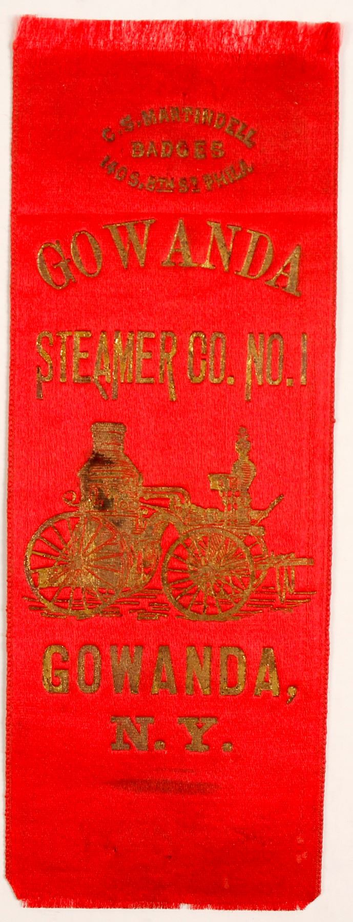 Red cloth ribbon with fire steamer and lettering in gold. 6.5 x 2.5".