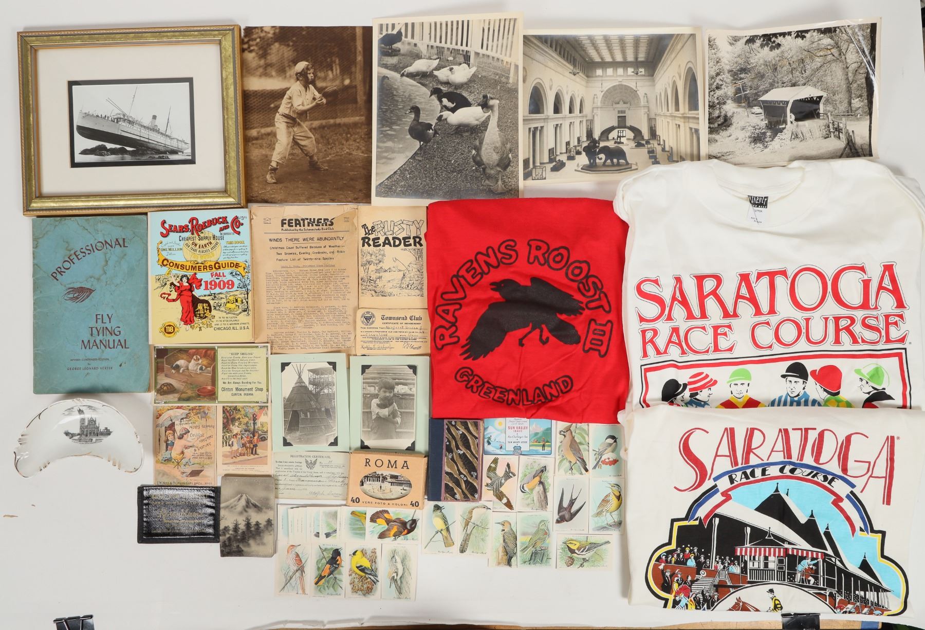 Over 25 items. I. E. ; Professional Fly Tying Manual 1950, Three T-Shirts @ from Saratoga Racetrack on from Greenland, 1990. Photo Princess May steamship run aground 1910. Dazzle Phot Maker and software, small box of tourist 40 photo's of Rome, small 1909 Sears, Roebuck & Co. catalog. 1950 toy Kaleidoscope, 1970 Earl Hines demo record and more items to discover.