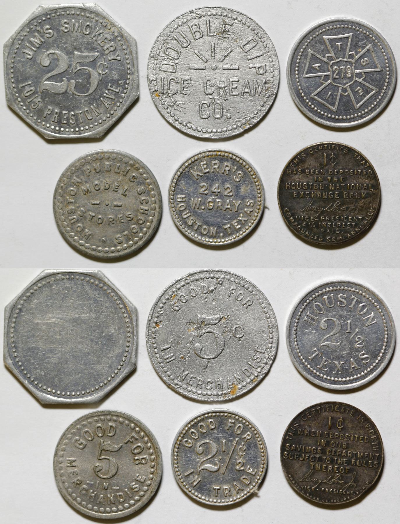 Six tokens. 1) Houston National Exchange Bank, 2) Double Dip Ice Cream Co., 3) Kerr's 242 W Gray, 4) Jim's Smokery, 5) Houston Public Schools, 6) ITASE 279. State: Texas City: Houston Date: HWAC# 85334