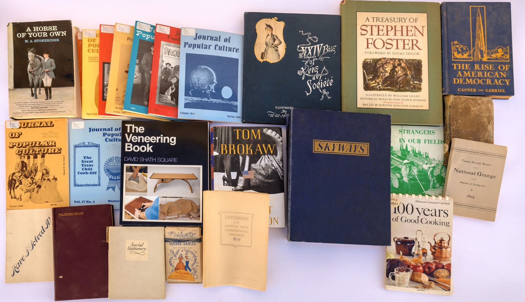 Wide assortment of books. A Treasury of the Familiar by Woods. Tolerance by Van Loon. The Proper Feeding and Care of Husbands by Schlesinger. How to Soar Like an Eagle by Stevenson. The Changing Educational World by Eurich. Audition by Walters. Weather Flying by Buck. The Study of Zoology by Huxley. Pro Football Trivia by Gill. The Making of America by la Follette. How to Pitch by Fuller. The Garden Gate by Very. The Riverside Song Book. Journal of Popular Culture 1982 and 1983. The Rise of American Democracy by Casner. 100 years of Good Cooking. Social Stationary by Clark. A Manual of Harmony by Jadassohn. The Memory Library by Downs. Views and Opinions by Ouida. The Secretary's Handbook. Outwitting Middle Age by Ramus. Journal of Popular Culture 1983-85. A Horse of Your Own by Stoneridge. The Greatest Generation by Brokaw. The Veneering Book. The Stars by Clock and Fist by Neely. A Treasury of Stephen Foster. Several Who's Who in Television and Radio. International Handbook of Historical Studies by Iggers. And more!