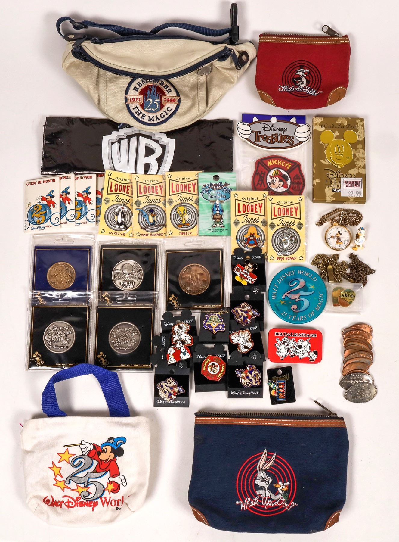 Includes large Pirates of the Caribbean, Epcot Center and Walt Disney World pins. That's all Folks and What's Up Folks small bags. Pins include Sylvester, Bugs Bunny, Tweety, The Big Taz-huna, etc. 101 Dalmatian pin. Mickey Mouse Watch. 10 plus elongated cents. 1996 Disney Belt.