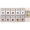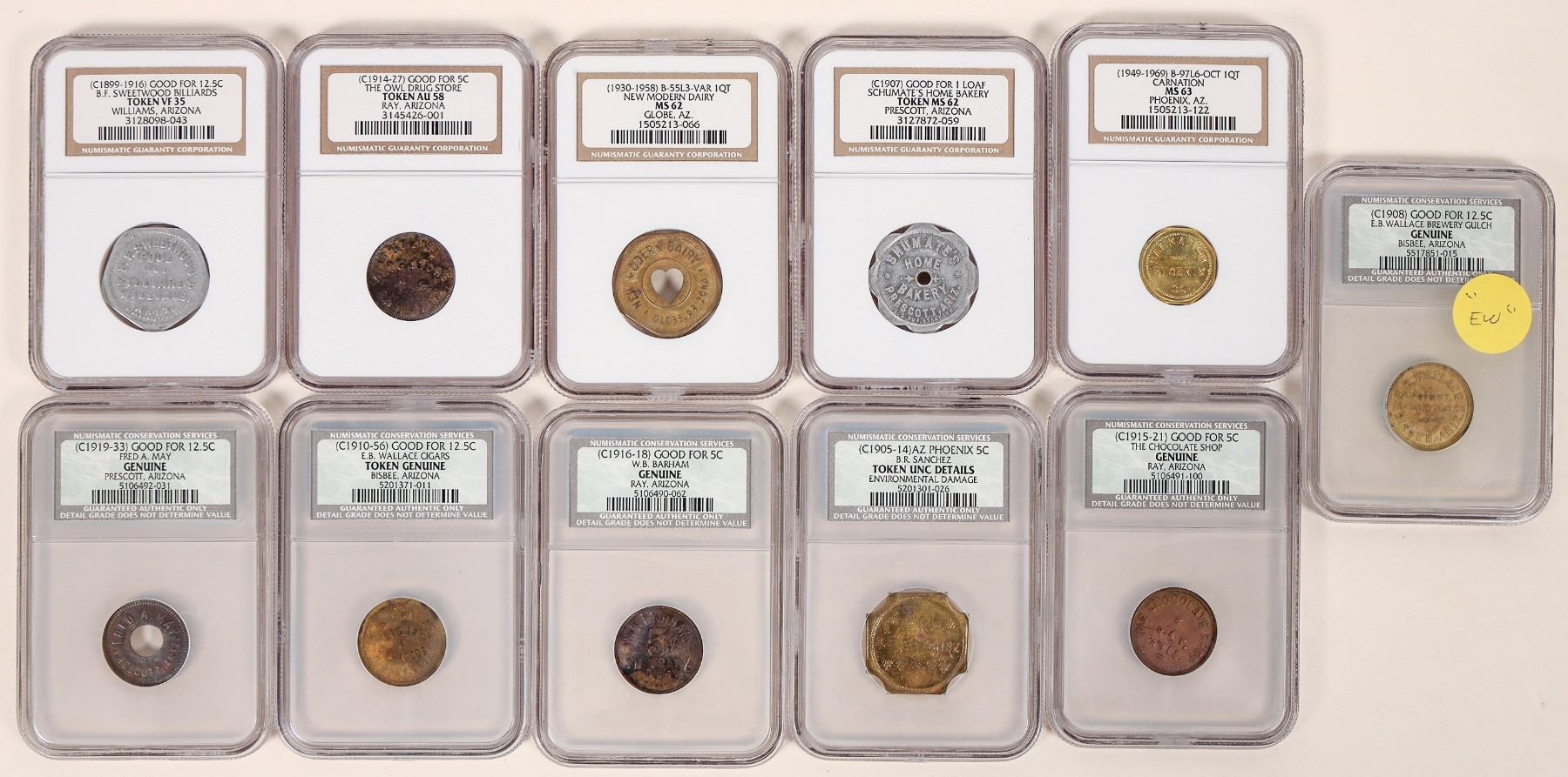 Lot of eleven graded Arizona tokens: 1) NGC MS 63: Carnation, Phoenix, GF 1 Qt.; 2) NGC MS 62: Schumate's Home Bakery, Prescott, GF 1 loaf; 3) NGC MS 62: New Modern Dairy, Globe, GF 1 Qt.; 4) NGC AU 58: The Owl Drug Store, Ray, GF 5c; 5) NGC VF 35: B. F. Sweetwood Billiards, Williams, GF 12.5c; 6) NCS Genuine: Fred A. May, Prescott, GF 12.5c; 7) NCS Token Genuine: E. B. Wallace Cigars, Bisbee, GF 12.5c; 8) NCS Genuine: W. B. Barham, Ray, GF 5c; 9) NCS Token Unc Details environmental damage: B.R. Sanchez, Phoenix, GF 5c; 10) NCS Genuine: The Chocolate Shop, Ray, GF 5c; 11) NCS Genuine: E. B. Wallace Brewery Gulch, Bisbee, GF 12.5c.