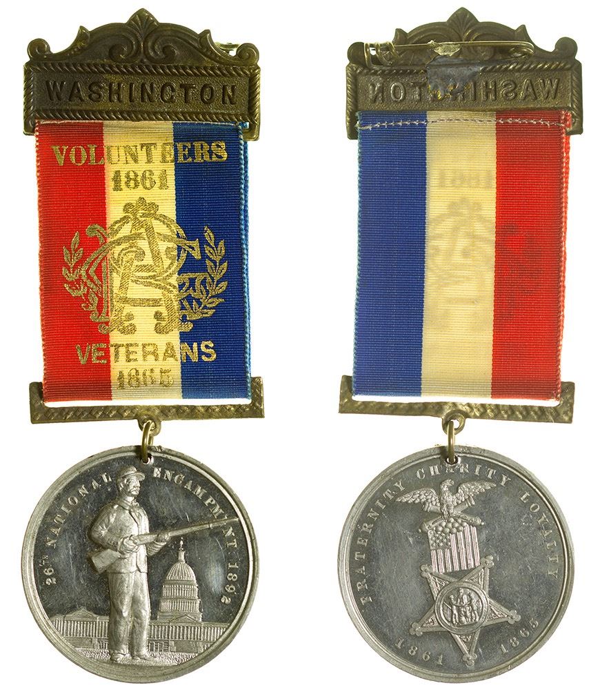 Pin badge from Washington's 1892 meeting of the Grand Army of the Republic. White Metal medallion commemorating the 26th national encampment 1892; reverse "Fraternity / Charity / Loyalty / 1861 / 1865. 38mm, brilliant uncirculated condition. The "Grand Army of the Republic" (GAR) was a fraternal organization composed of veterans of the Union Army (United States Army), Union Navy (U.S. Navy), Marines and the U.S. Revenue Cutter Service who served in the American Civil War for the Northern/Federal forces. Founded in 1866 in Decatur, Illinois, and growing to include hundreds of posts (local community units) across the nation (predominately in the North, but also a few in the South and West), it was dissolved in 1956 at the death of its last member, Albert Woolson (1850–1956) of Duluth, Minnesota. City: State: Date: 1892 HWAC# 51329