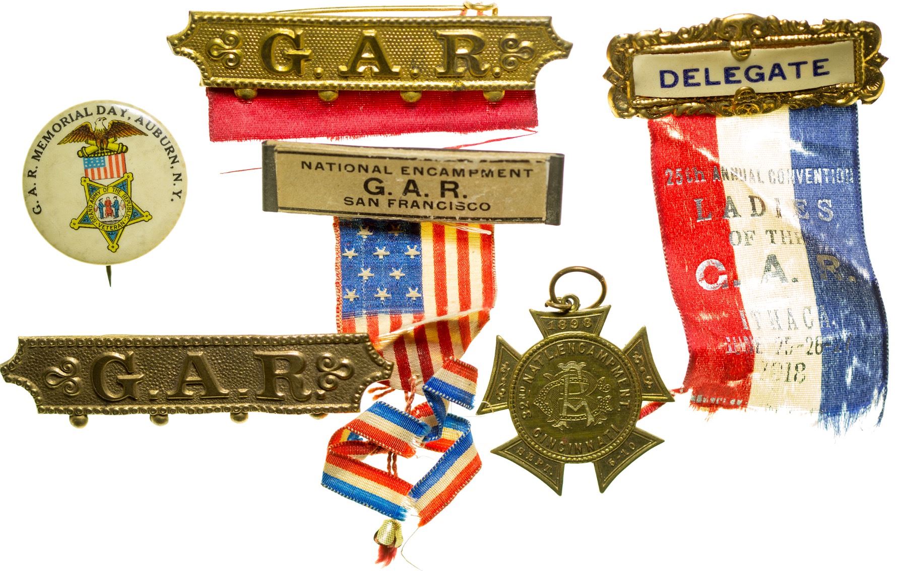 Lot of six items from the Grand Army of the Republic, the fraternal organization formed following the Civil War. Includes: Two pins say G.A. R. A delegate's badge to the 25th annual convention Ladies of the G.A.R. in Ithaca, New York, June 25,26,27 1918. A pin from the national encampment G.A.R. in San Francisco. A button from the G.A.R. Memorial Day, Auburn, New York. A brass medallion dated 1898 from the 32nd encampment at Cincinnati Sept. 5-10.