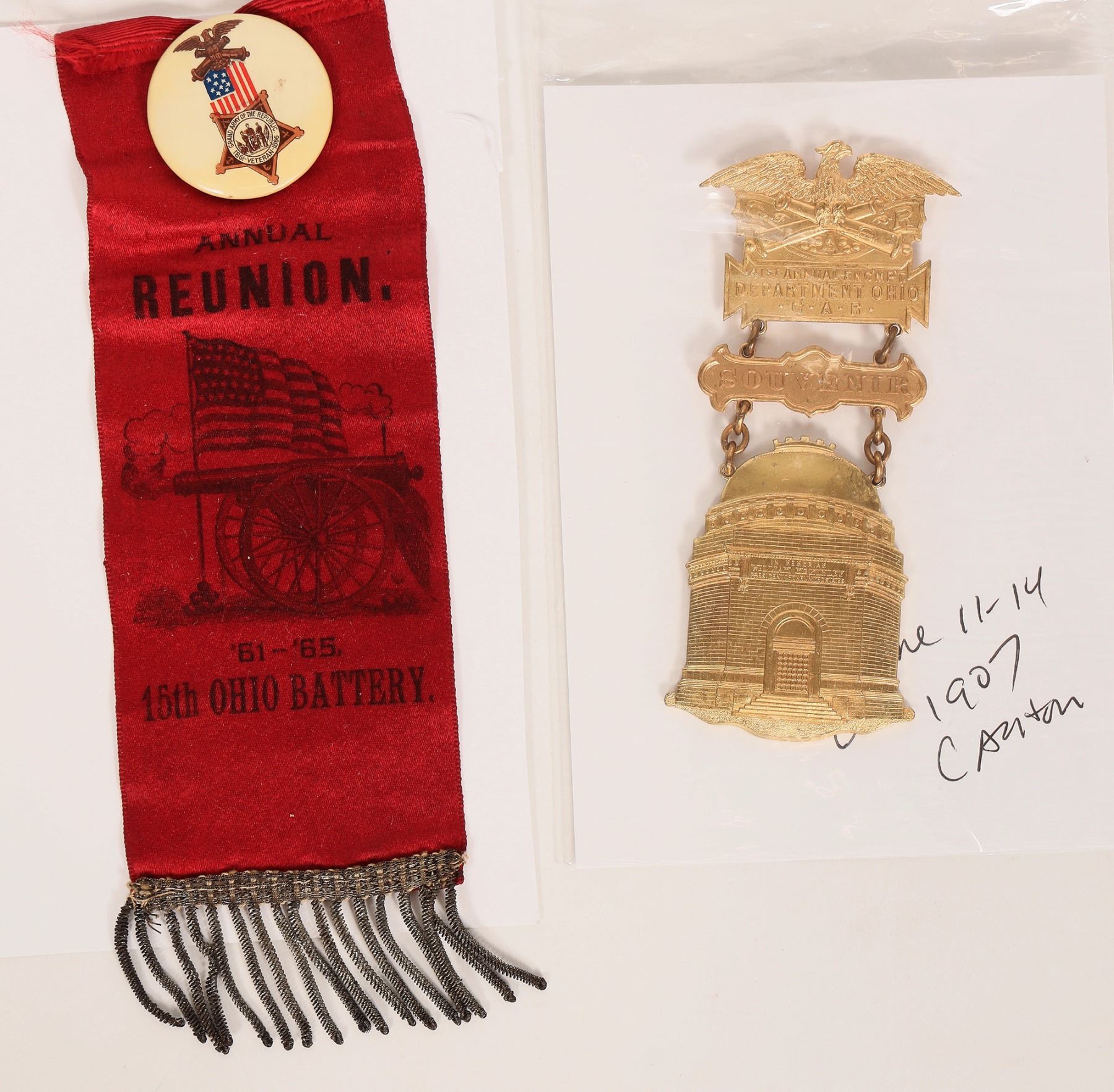 Lot of two souvenir badges from the Ohio delegation of the the Grand Army of the Republic: 1) 41th annual encampment, June 11-14, 1907, Canton; brass, 4 inches long 2 inches wide; 2) Red ribbon & celluloid pinback: Annual Reunion /'61-'65 / 15th Ohio Battery. 6 1/2 inches long; 2 inches wide.[ Ohio
