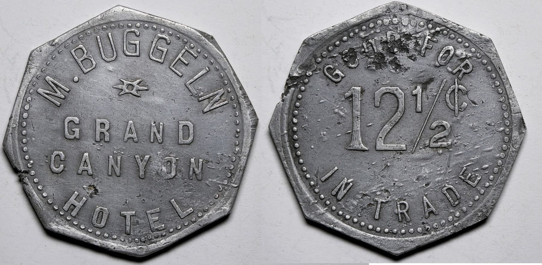 M. Buggeln/Grand /Canyon/Hotel//G.F./ 12 1/2¢/ In Trade. Oct., A.L., 27mm. Some pitting.